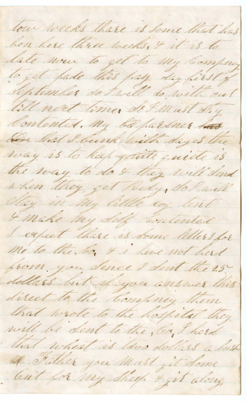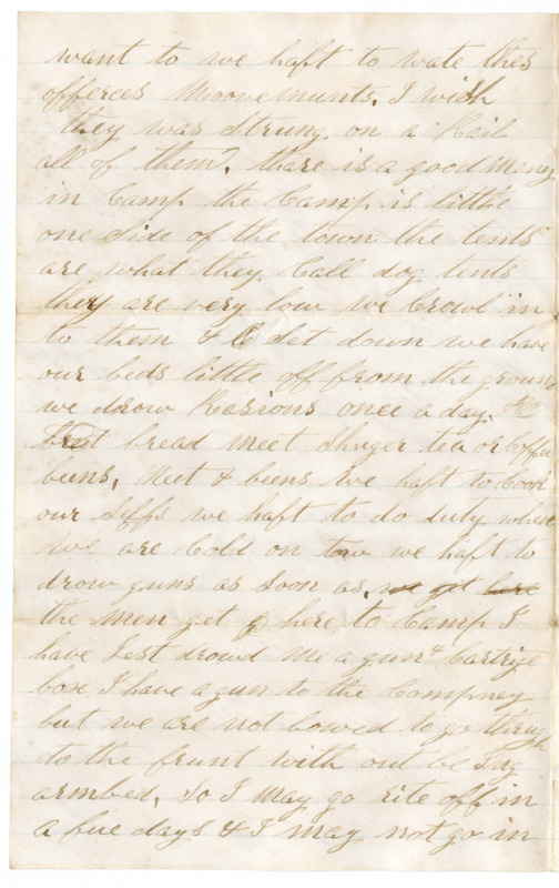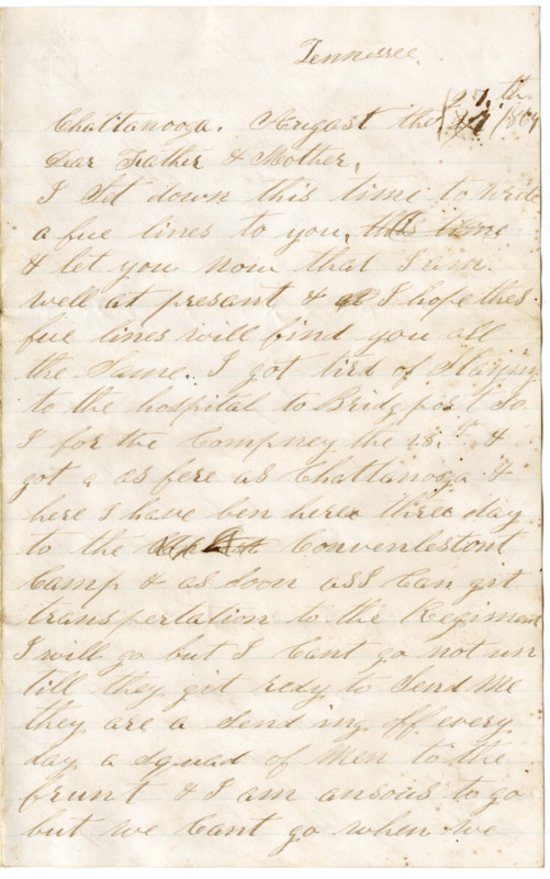 I Set down this time to write a fue lines to you this time & let you now that I am well at presant & I hope thes fue lines will find you all the Same. I got tird of Staying to the hospital to Bridgport So I for the Compney the 28th & got as fere as Chattanooga & here I have ben here three day to the Conlest Convenlestont Camp & as Soon as I Can git transpertation to the Regiment I will go but I Cant go not un till they git redy to Send me they are a Sending off every day a Squad of men to the frunt & I am ansous to go but we Cant go when we want to we haft to wate thes offerces moovemunts. I wish they was Strung on a Rail all of them. thare is a good meney in Camp the Camp is little one Side of the town the tents are what they call dog tents they are very low we Crowl in to them & Set down we have our beds little off from the ground we drow Rasions once a day. bred bread meet shuger tea or Coffee beens. meet & beens we haft to cook our selfs we haft to do duty when we are Cold on tow we haft to drow guns as Soon as we git here the men get here to Camp I have Jest drowed me a gun & Cartrige case I have a gun to the Compney but we are not lowed to go thrugh to the frunt with out being armbed. So I may go rite off in a fue days & I may not go in tow weeks thare is Some that has ben here three weeks. & it is to late now to get to my Compney to get pade this pay day first of September So I will do with out till next time. So I must stay Contented. My pardner has ben that I bunk with Sayes the way is to keep quite quiete is the way to do & they will Send when they get Redy. So I will Stay in my little dog tent & make my Self Contented I expect thare is Some letters for me to the Co. & i heve not herd from you Sence I Sent the 25 dollars but if you answer this direct to the Compney them that wrote to the hospital they will be Sent to the Co. I herd that wheat is two dollars a bushal. Father you must git Some Cut for my Sheep & git along the best you Can. I hope this war will play out be fore long. I hope that we will get Some one in linkon place this fall that dont like niger blud better then white blud.