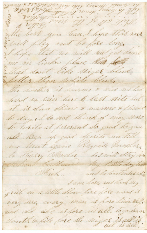 So I will Stay in my little dog tent and be Contented which I am here, and Cook my grub on a little Slow fire fore wood is very dere. every man is fore him Self. and old Abe is for us all to go down South & fite fore the niger is all is all is all.