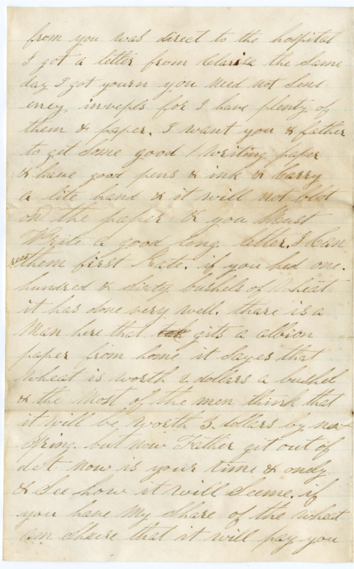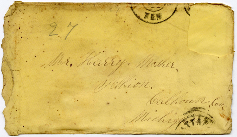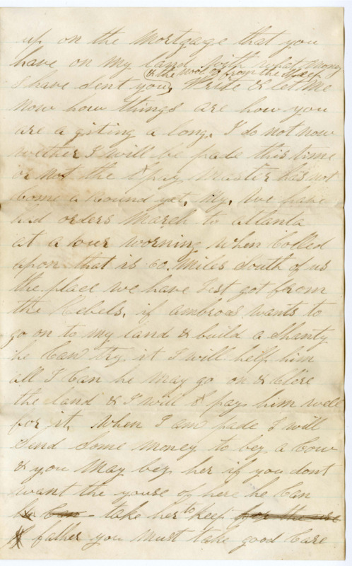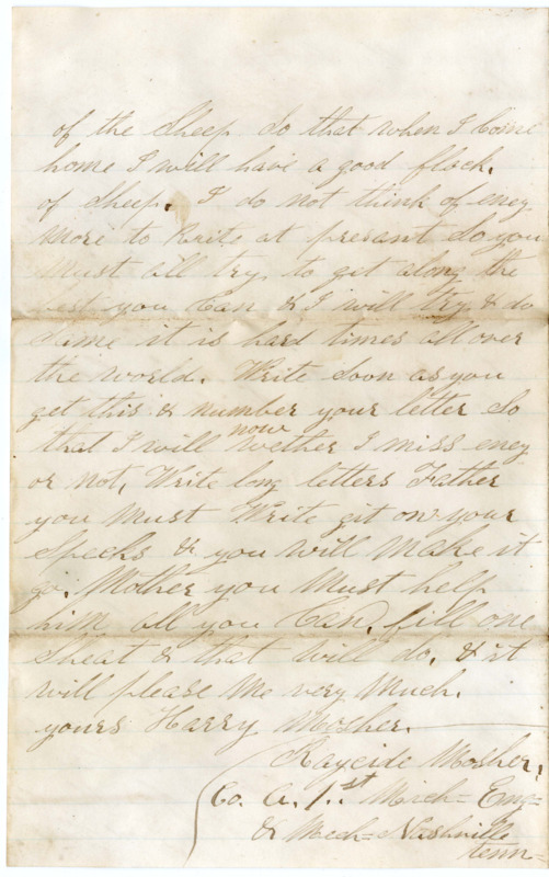 I Set down to write a fue lines to you I got a letter from you yesterday & was glad to here from you I hante herd from you in Some time because I have ben mooving around So much I am with the Compney now & am not very well, but I hope thes fue lines will find you all well I am So to be a bout but not able to do eney thing & I hante agoing to a man that works here in the armey he wants a Constatution like a horse & that I have not got but i think I Shall Stand it thrugh Some how for I think & the Most of the Men that the war will be over this fall or next Spring I have ben with the Compney ever the 29 of Augast the letter that I got from you was direct to the hospital I got a letter from Clarisa the Same day I got yourn you need not Send eney invepls for I have plenty of them & paper. I want you & father to get Some good writing paper & have good pens & ink & Carry a lite hand & it will not blot on the paper & you Must Write a good long letter. I Can read them first Rate. if you had one hundred & Sixty bushels of wheat it has done very well. thare is a man here that tak gits a Albion paper from home it Sayes that wheat is worth 2 dollars a bushel & the most of the men think that it will be worth 3 dollars by next Spring. but now Father git out of det. now is your time & onely & See how it will Seeme. if you have my Share of the wheat am Shure that it will pay you up on the Mortgage that you have on my land with what money I have Sent you & the wool of from the Sheep Write & let me now how things are how you are a giting along. I do not now wether I will be pade this time or not the pay Master has not Come a Round yet. My. We have had orders March to atlanta at a hour worning when Colled apon that is 60. miles South of us the place we have Jest got from the Rebels. if Ambroes wants to go on to my land & build a Shanty he Can try it I will help him all I Can he may go on & Clere the land & I will pay him well for it. When I am pade I will Send Some money to bey a Cow & you May bey her if you dont want the youse of here he Can he Can take her to keep for the use of father you must take good care of the Sheep So that when I Come home I will have a good flock of Sheep. I do not think of eney more to Rite at presant So you must all try to get along the best you Can & I will try & do Same it is hard times all over the world. Write Soon as you get this & number your letter So that I will now wether I miss eney or not. Write long letters Father you must Write git on your Specks & you will make it go. Mother you Must help him all you Can. fill one Sheat & that will do. & it will please me very much. yours Harry Mosher.