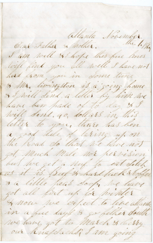 I am well & I hope thes fue lines will find you all well I have not herd from you in Some time & Mr. livingston is a going home & I will send a letter by him we have ben pade of to day & I will Send .40. dollars in this letter to you. thare has ben a good dele of taring up on the Road So that we have not got much male nor pervision but we get a nuf to eat Setch as it is. Beef & hard tack & Coffee & a little peas Soop. we have got all fixt up for winter & now we expect to leve atlanta in a fue days & go fether South we have got to March & Cerry our knapsacks. I am going to try it I think I Can march we do not no whare we are a going yet but it is Some whare nere the atlantic Oshion