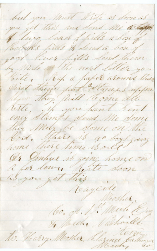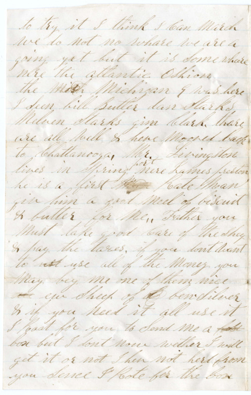 the Mish Michigan 9 was here I Seen bill Butler dan Starks, Melven Starks gim Clark. thare are all well & heve mooved back to Chattanooga. Mr. Livingston lives in Springport nere James preston he is a first man Rate man giv him a good meel of biscuit & butter for me. Father you must take good Care of the Sheep & pay the taxes. if you dont want to ust use all of the money you may bey me one of them nice ue ew Sheep of ben Silver & if you need it all use it I Roat for you to Send me a post box but I dont now wether I will get it or not I hev not herd from you Sence I Rote for the box but you must Write as Soon as you get this and Send me a cople two boxes of pills a box of Robaks pills & Send a box of good liver pills Send them by male in the next letter you Rite. Rap a paper around them Dirct them put 2 Stamps uppon them they will Come all Rite. if you hant Sent eney Stamps Send me Some they may be Some on the Road. thare is 40 boys going home there time is out Dr. Donhue is going home on a fer low. Rite Soon as you get this.