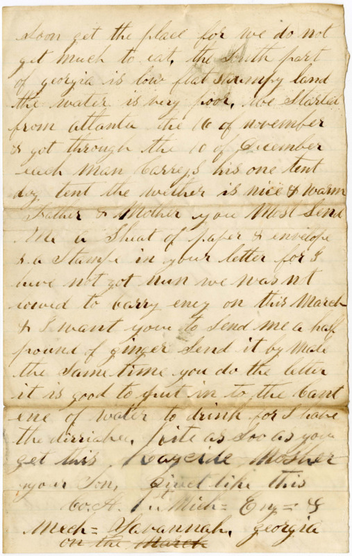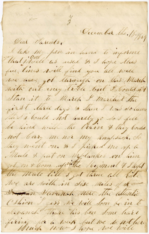 I take my pen in hand to informe you that I am well as usal & I hope thes fue lines will find you all well we have got through on this March with out eney troble but I could not Stan it to March I marched the first three days & then I was So lame that I Could not hardly go So I fell be hind with the train & they Could not Cerry me nor my Knapsack. So they went on. & I picked me up a Mule & put on my blankes on him got on & Com up with the Regiment & I kept the mule till I got thrue all Rite we are with in Six miles of Svanan Savanah nere the atlantic Oshion I gess we will Soon be in to Savanah thare hes ben Some hard firing for a week but we do not here much now I hope we will Soon get the place for we do not get much to eat. the South part of georgia is low flat swampy land the water is very poor. we Started from atlanta the 16 of November & got through the 10 of December each man Carrys his one tent dog tent the wether is nice & warm Father & Mother you Most Sent Me a Sheat of paper & envelope & a Stampe in your letter for I heve not got nun we was not lowed to Carry eney on this March & I want you to Send me a half pound of ginger Send it by Male the Same time you do the letter it is good to put in to the Cantene of water to drink for I have the dirriahee. Rite as Soon as you get this