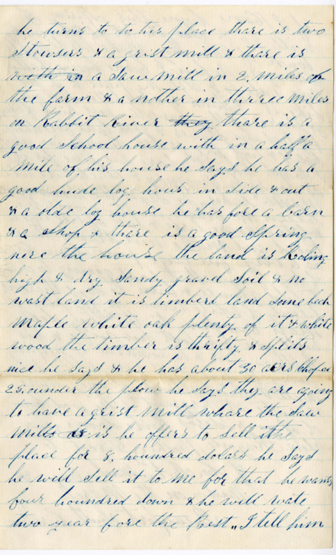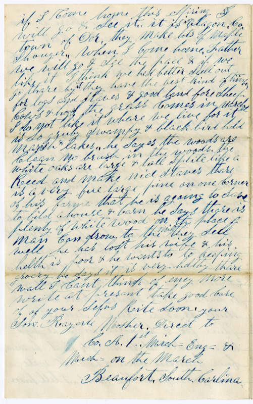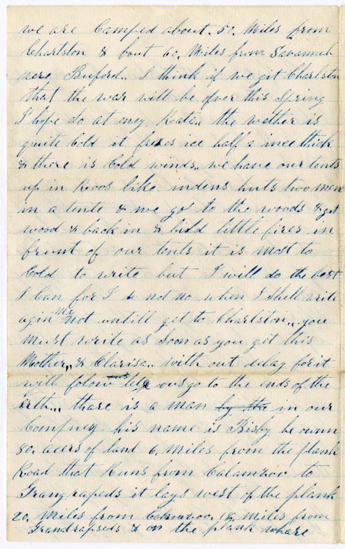 I Set down to write a fue lines to day for I think I Can rite more this time I wrote a letter yesterday & I was in Setch a hurry that I Could not write much but we are in Camp yet & ma Say yet & may stay here a week & we may not have orders to march is before I get this letter wrote we are agoing for Charlston when we leve & Jenerl Shirmon is very nere the place I expect & he is bound to go in with his army & take the place if they dont Come to hirs tirms. & Jenerl Shirmon made a big Rade when we Come through Georgia & took Savannah & South Carlina hats to have him Come through & scour the Country So they are want to Come to Some tirms but if not we are going Strate through & take Charlston & we go in after the place is takon & fortify the place we are Camped about .50. miles from Charlston & bout 60. Miles from Savannah nere Buford. I think if we git Charlston that the war will be ofver this Spring I hope So at eney Rate. the wether is quite Cold it freses ice half a ince thick & there is Cold winds. we have our tents up in Roos like indens huts two men in a tente & we go to the woods & get wood & back in & bild little fires in frunt of our tents it is most to Cold to write but I will do the best I Can for I do not no when I Shell write agin may not untill get to Charlston. you must write as Soon as you get this Mother. & Clarisa. with out delay for it will folow let ous go to the ends of the erth. thare is a man by the in our Compney his name is Bisby he ownn 80. acers of land 6. miles from the plank Road that Runs from Calamzoo to Grang rapeds it lays west of the plank 20. miles from Colamzoo .18. miles from Grandrapseds & on the plank whare he turns to to his place thare is two Stowsers & a grist mill & thare is with in a Sawmill in 2. miles of the farm & a nother in thrree miles on Rabbit River they thare is a good School house with in a half mile of his house he Says he has a good hude log hous in Side & out & a olde log house he has fore a barn & a Shop & thare is a good Spring nere the house the land is Roling high & dry Sandy gravel Soil & no wast land it is timberd land Some bech maple white oak plenty of it & white wood the timber is thrifty & Splits nice he says & he has about 30 acrs Choped 25. ounder the plow he Says they are agoing to have a grist mill whare the Saw mil ls is is he offers to Sell the place for 8. houndred dolars he Says he will Sell it to me for that he wants four houndred down & he will wate two years fore the Rest. I tell him if I Come home this Spiring I will go & See it. it is in Alagon Co. town of Dor. they make lots of Maple Shouger. when I Come home, Father we will go & see the pace & if we like it I think we hed better Seell out go thare by it they have the best kind of timber for logs and Staves & good land fore Sheep, Cows & hogs the grass Comes in march I do not like it whare we live for it is so gruby swampy & black bird hold Marsh & lakes. he Sayes the woods are Clean no brush in the woods. the white oaks are large & tall Splite like a Reed and make nice Staves thare is a very fue large pine on one Corner of his farme that he is agoing to Save to bild a house & barn he Says thare is plenty of white wood on the place a man Can drow to the mill they Sell well he has lost his wife & his helth is poor & he wants to to keeping grocry he Says it is very helthy thare wall I Cant think of eney more write at presant take good Care of of your Sefns