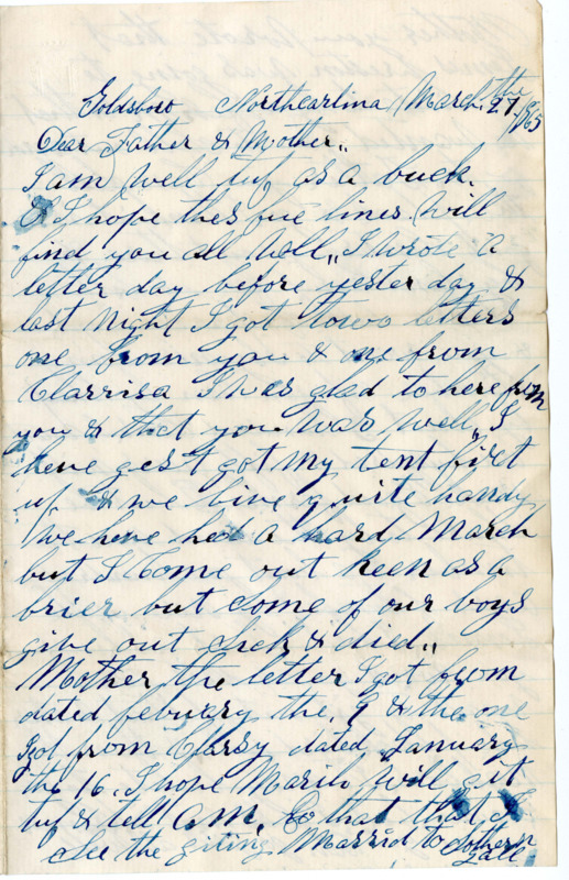 I am well tuf as a buck & I hope thes fue lines will find you all well. I wrote a letter day before yester day & last night I got towo letters one from you & one from Clarrisa I was glad to here from you & that you was well. I heve gest got my tent fixt up & we live quite handy we heve hed a hard March but I Come out keen as a brier but Some of our boys give out Sick & died.
