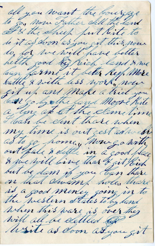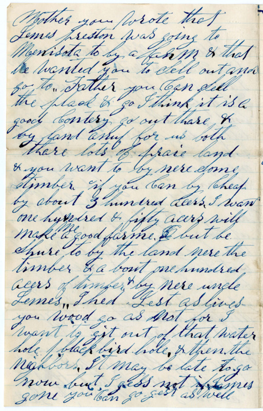 Mother you wrote that Jemes preston was going to Menisota to by a farm & that he wanted you to Sell out and go to. Father you Can Sell the place & go I think it is a good Contery go out thare & by land anuf for us both thare lots of praie land & you want to by nere Some timber if you Can by Cheap by about 3 hundred acers. I want one hundred & fifty acers will make me a good farme. but be Shure to by the land nere the timber & a bout one hundred acers of timber & by nere uncle Jemes. I hed Jest as lives you wood go as not for I want to git out of that water hole/black bird hole. & then the nighbors. It may be late to go now but I gess not if James gone you Can go gest as well all you want the Courgage to go. now Father Sell the land & the Sheep. put Rite to do it as Soon as you git this. now do for we will have better helth good big Rich land & we Can farme it better keep more Cattle & with less work. now git up and make a triel you Can go by the land Moove Rite a long at at the Same time I Can be Sent thare when my time is out gest as well as to go home. Now go with out fale & Settle in a good place & we will live thar & git Rich but be dam if you Can thare on that Swamp hole. thare is a good meney going in to the western States to by land when this ware is over they will all be Settled