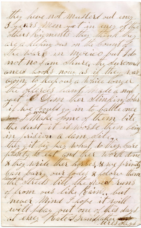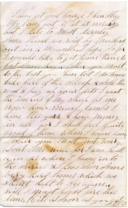Some think we will be musterd out in a mounth. I hope So for I would like to get home time to Cut Some hay. father you must do the best you Can till I do Come take Care of the Sheep & Sell the wool & pay up your dets I want the increes of my Sheep let me now how meney lambs I have this year & how meney in all for I Shall feel quite proud of them when I Come home Mother you most not worry about me now for I am well agin as when I Came in to the Surves & I heve Seen Some very hard times which we Shant haft to See agane.