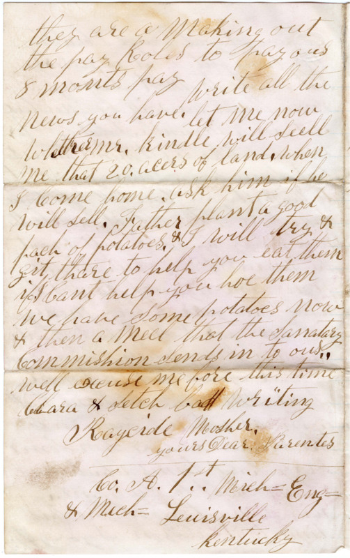 will I must Close fore this time. Rite as Soon as you get this. they are a making out the pay Roles to pay ous 8 monts pay write all the news you have. let me now whether Mr. Kindle will Seell me that 20. acers of land when I Come home. ask him if he will Sell. Father plant a good pach of potatoes & I will try & git thare to help you eat them if I Cant help you hoe them we have Some potatoes now & then a Meel that the Sanatary Commishion Sends in to ous.