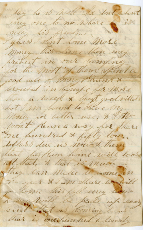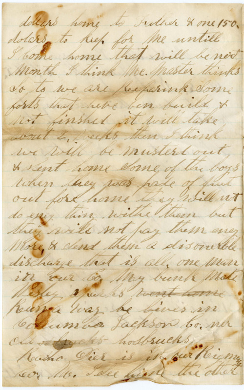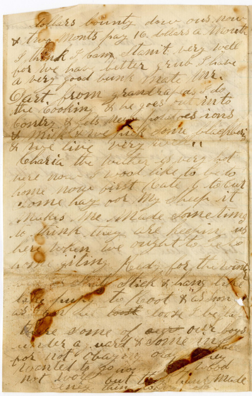 I guess I Sent home more money this time then eney priveet in our Compney for the Most of them Spent a good eale of money got drunk & Croused in Campe for more then a week & bout good vittuls but I am bound to Save my money for better use. & I Mr wont Run a way for thare is one hundred & fifty tow.. dollars due us not & them that hes Run home will loose all that. & that is much as they can make to home in one year & I am Shure we will go home this fall eney how & we will be pade up every Cent that is Coming to us thar is one hundred & twenty dollars bounty dow ous now & two monts pay 16. dollars a month I think I Can Stanit very well for we have better grub I have a very good bunk mate Mr. Dart from grandrapeds I do the Cooking & he goes out into Contry & gets new potatoes ions & Milk & we pick Some blackberries & we live very well..