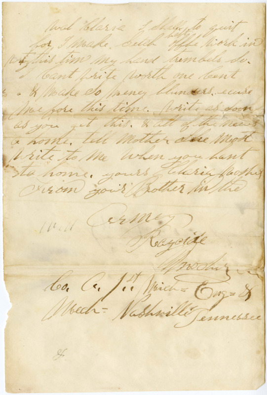 - Letter from Raycide Mosher to his sister, Clarissa Mosher; includes discussion of Raycide's movement from Louisville to Nashville, saving and spending money, and the food available in and around camp.