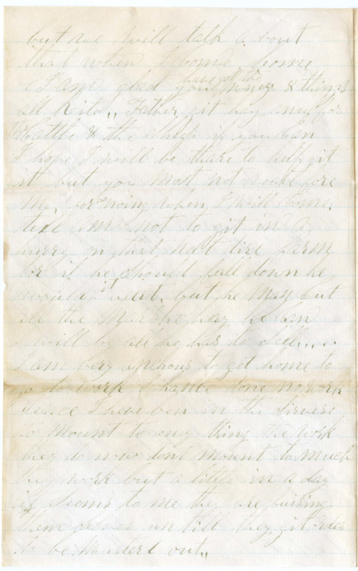 I am very anchous to get home to go to work I hante done no work Sence I heve ben in the Sirvese to mount to eney thing the work they do now dont mount to much they work but a little in a day it Seems to me they are buising them Selves un till they git orders to be musterd out..