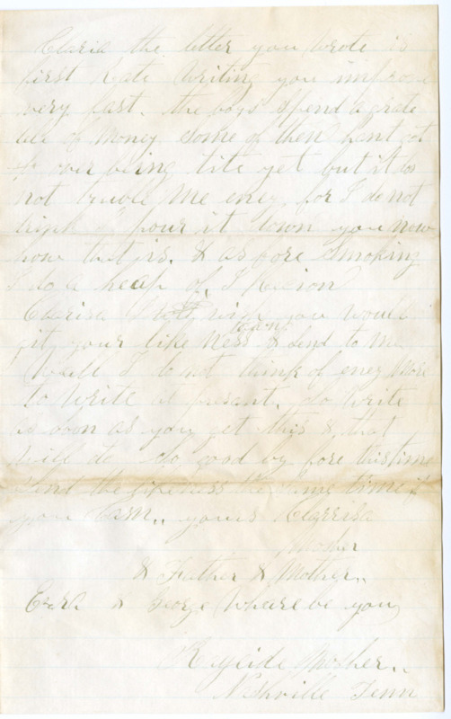 Claria the letter you wrote is first Rate writing you improve very fast. the boys Spend a grate dele of money Some of them hant got over being tite yet but it dos not truble me eney for I do not drink I pour it down you now how that is. & as fore Smoking I do a heap of I Recion