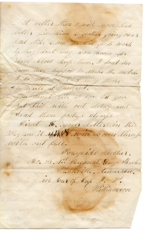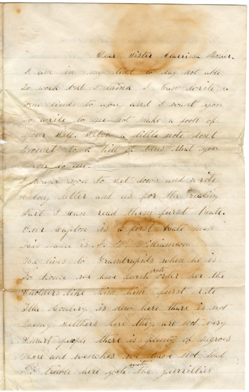 I want you to Set down and write a long letter and as for the reading Part I Can read them furst Rate. Our Capton is a first Rate man His name is J .W. Williamson He lives to Grandrapids when he is to home we have furst rate order her the Sholders like him him furst rate The Contery is new here thare is not Meney Settlers here they are not very Smart people thare is plenty of negroes Here and wenches we have not had No truble here yet with the gurrillies The Cavelmen have taken Some Prisners but they did not fite much We have mooved Sence we have ben her We mooved a bout Seven miles. we Are a bout fiftey Six miles north West of North Nashville