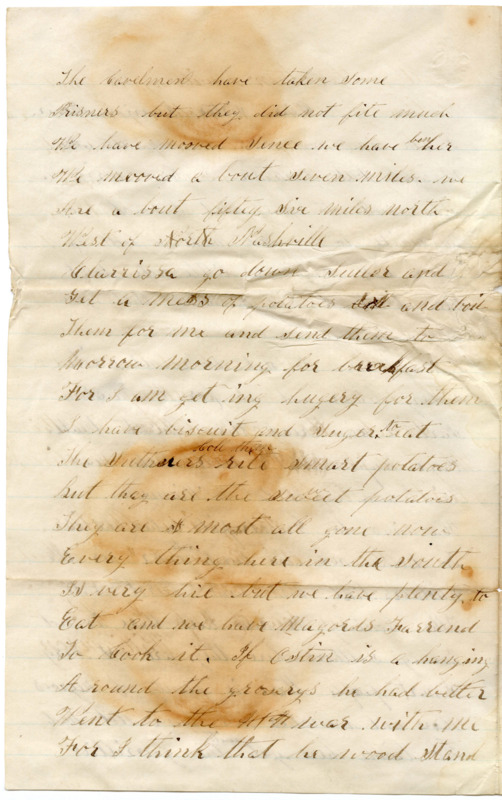 Clarrissa go down Suller and Get a mess of potatoes boil and boil them for me and send them to morrow morning for breakfast For I am get ing hugery for them I have biscuit and suger to eat The Suthners Coll them rite Smart potatoes But they are the Sweet potatoes They are most all gone now Every thing here in the South is very hie but we have plenty to Eat and we have Magords Farrend to Cook it. If Ostin is a hanging A round the groserys he had better Went to the war with me For I think that he wood Stand It better then I will you had better giv him another going over And like a nuf he will go to work If they dont eney won Come after Them Cloes keep them. I dont See How they happon to make the mestake I do not think of eney more to write at present.