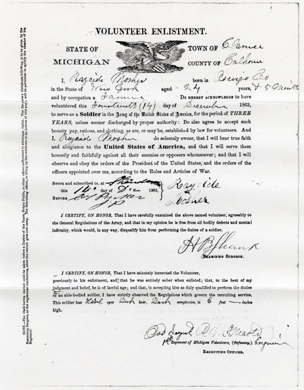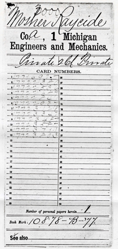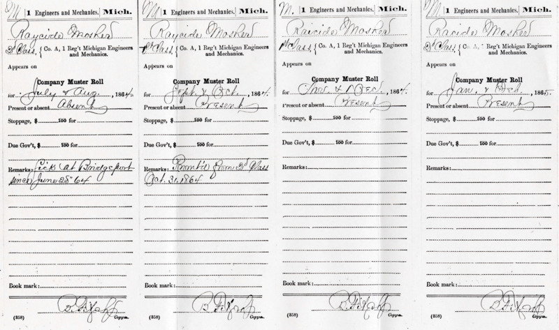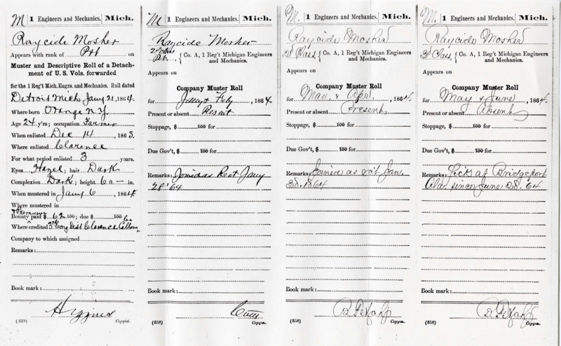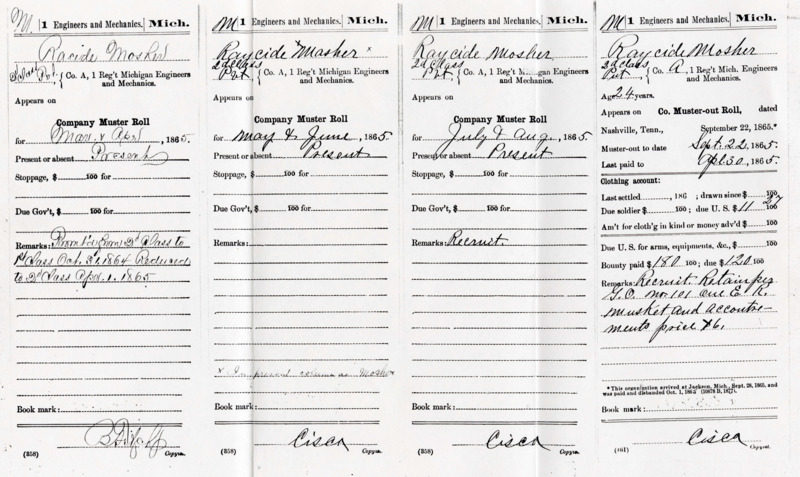 "Military records of Raycide Mosher", Raycide Mosher Civil War Letters, University of Idaho Library Digital Collections, https://www.lib.uidaho.edu/digital/mosher/items/mosher260.html