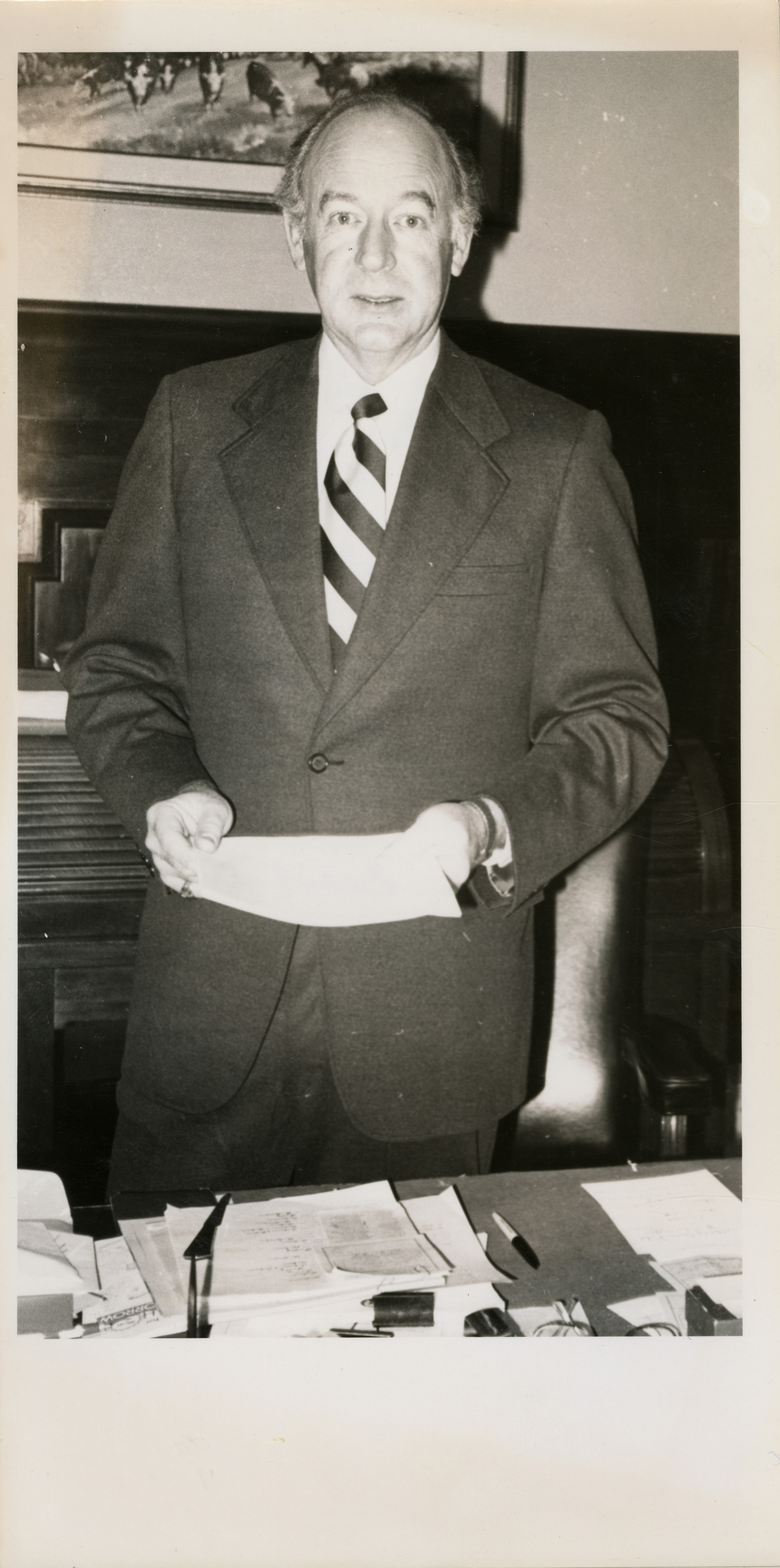 - Photo Description: Governor Andrus standing at a desk and holding a piece of paper. Text back translation "Governor Cecil D. Andrus" Notes read on back "100 Thursday [Indistinct] Boise Idaho Gov. Cecil D. Andrus