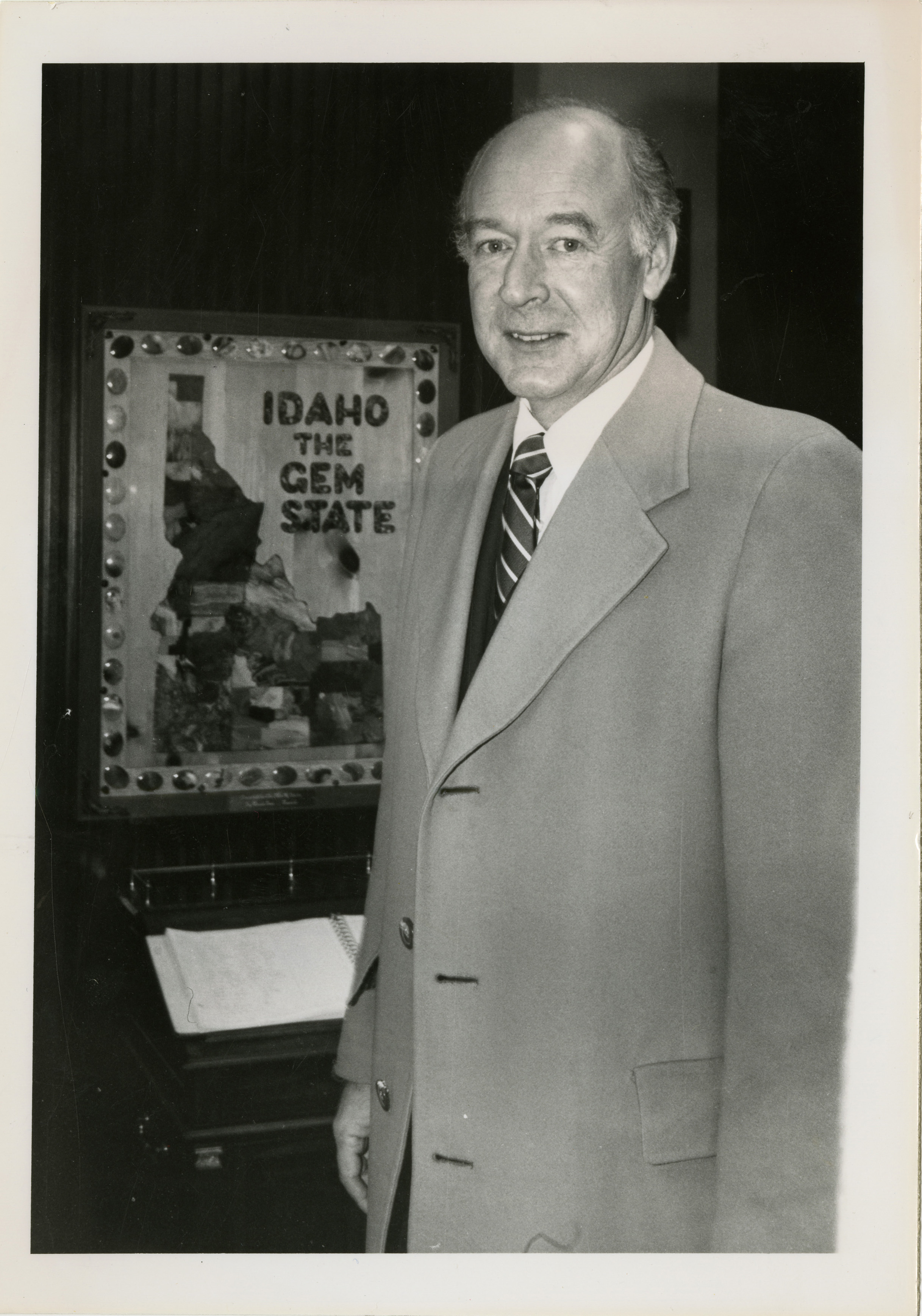 - Photo Description: Governor Andrus standing in front of a frame with an outline of Idaho and it says Idaho the Gem State. Text back translation "Governor Cecil D. Andrus" Notes read on back "2x5 Boise - Idaho Gov - Cecil D. Andrus"