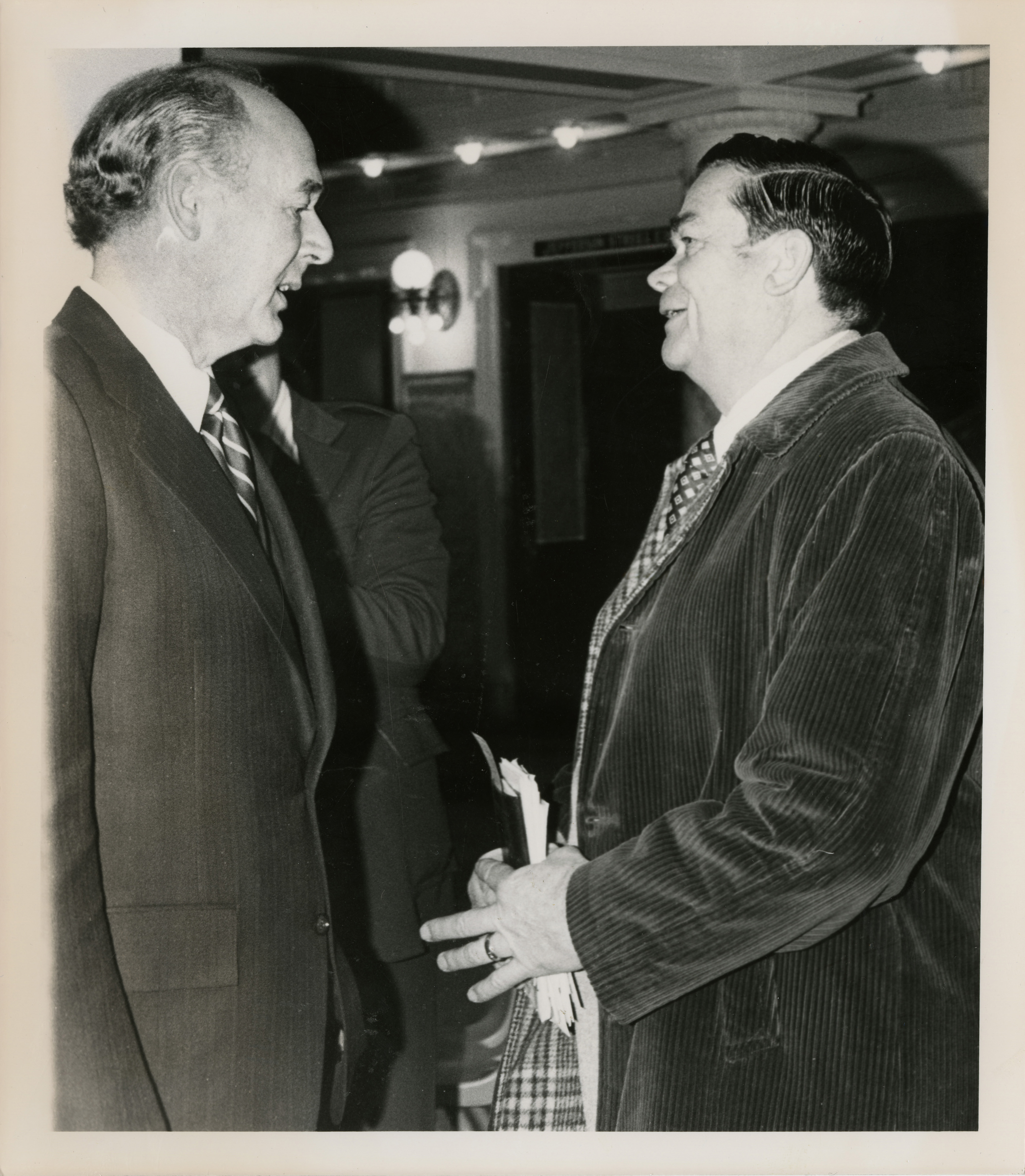 - Photo Description: Governor Andrus and Senator Chase having a conversation. Text back translation "Governor Cecil D Andrus Idaho Senator Minority Leader Cy Chase (D)" Notes read on back "3x6 1/2 Boise - Senate Minority Leader"