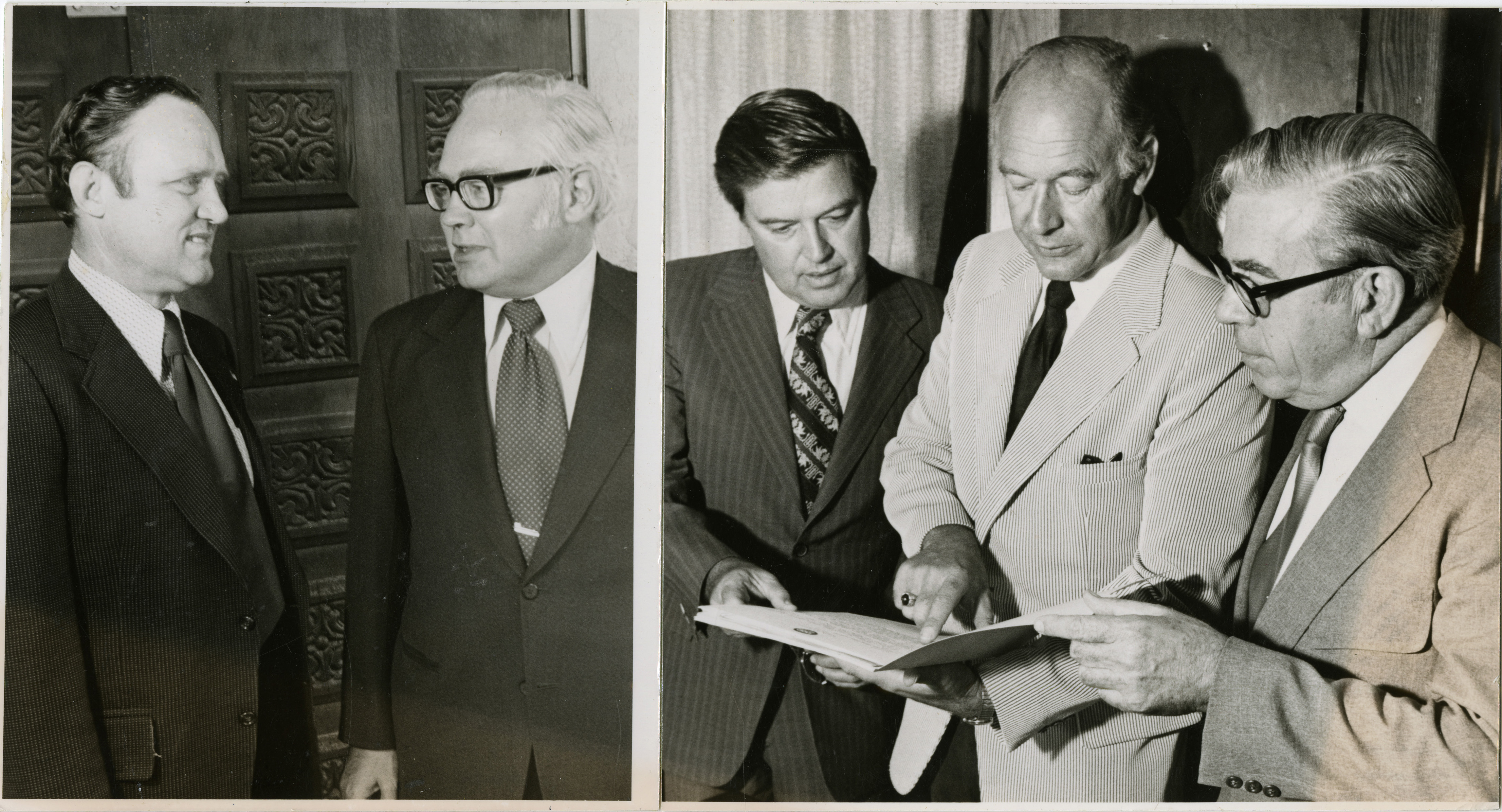 - Photo Description: In the picture on the left, Senator McClure and District Congressman Hansen are talking in the picture. In the picture to the right, Senator Church, Governor Andrus, and an unknown person are pictured all reading a file. Text back translation " Senator James McClure and District Congressman Orval Hansen; Senator Frank Church Governor Cecil D. Andrus Unknown"