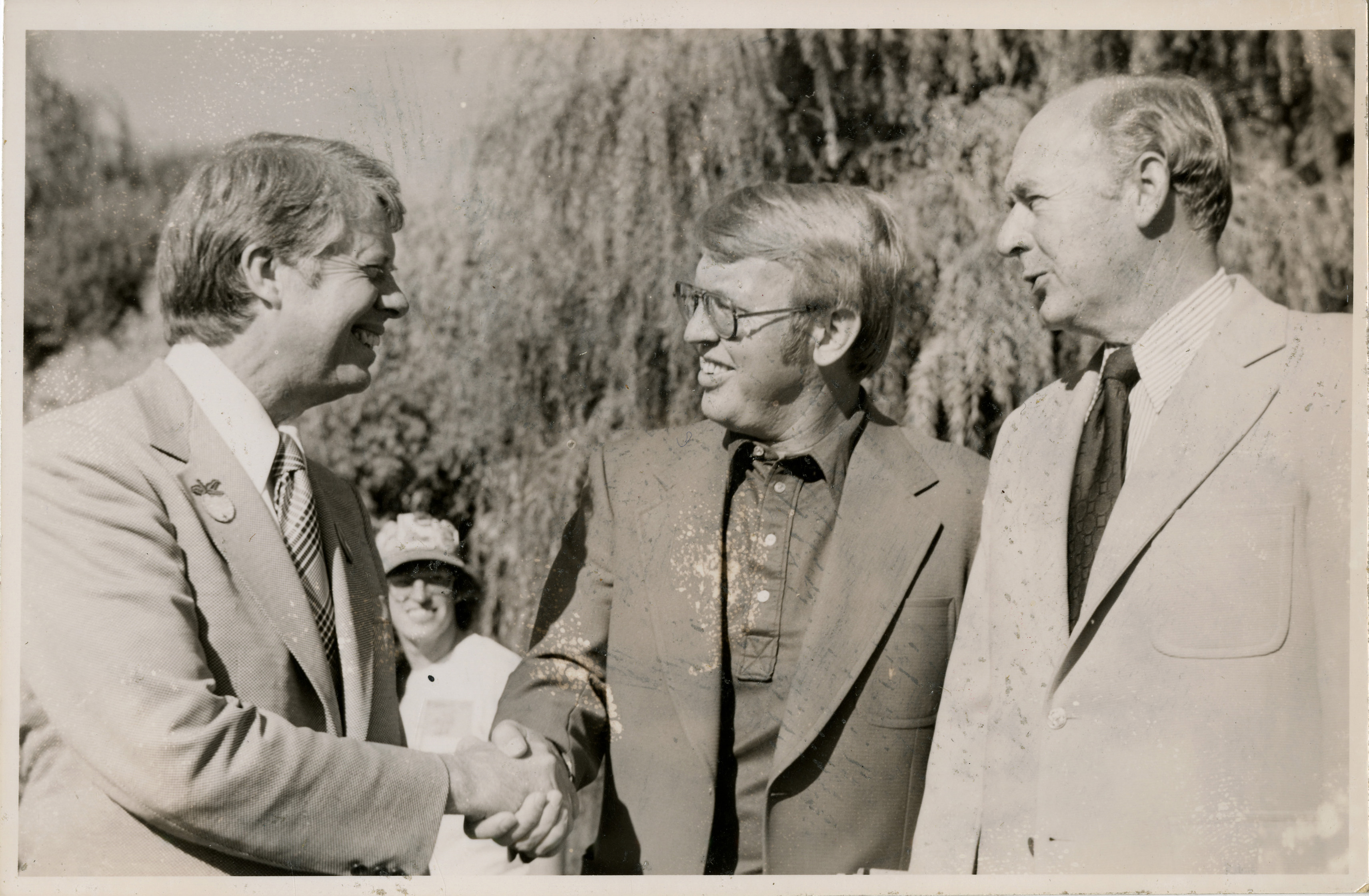 - Photo Description: Governor Carter and Attorney General Park are smiling and shaking hands with Governor Andrus (D) right next to them also smiling. Text back translation "Governor Jimmy Carter Attorney General Tony Park Governor Cecil Andrus; this shows Georgia Gov. - Jimmy Cart" Notes read on back "3x3 1/2 Pocatello, Georgia, Gov, lef [crossed out]"