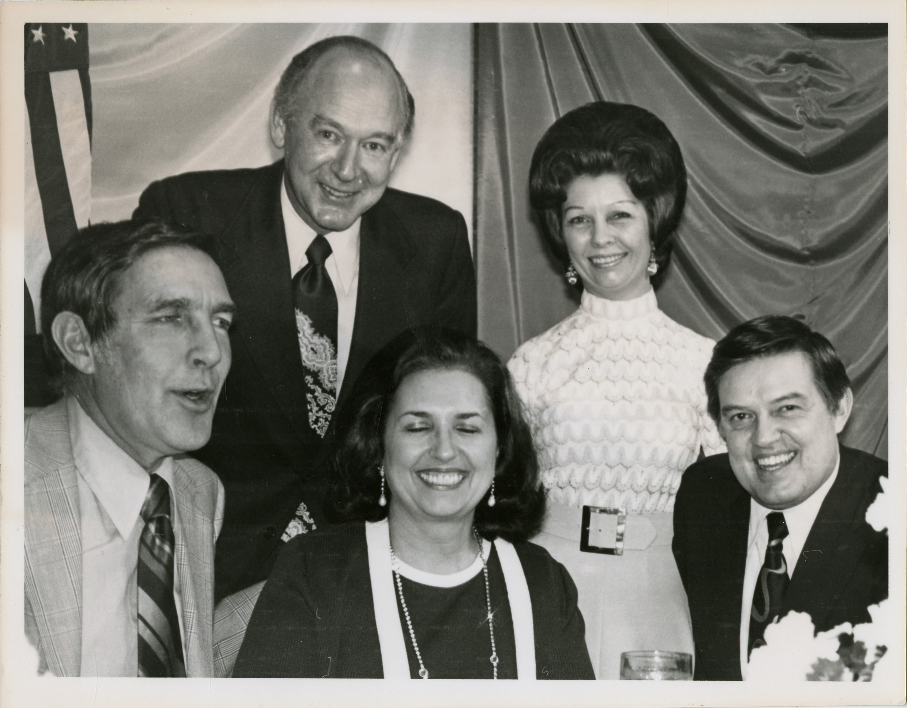 - Photo Description: Stewart Udall, Governor Cecil Andrus, Bethine Church, Carol Andrus, and Senator Frank Church are all dressed up and posing for a picture at a banquet. Text back translation "Botse - Key Performers 2x3 3/5"