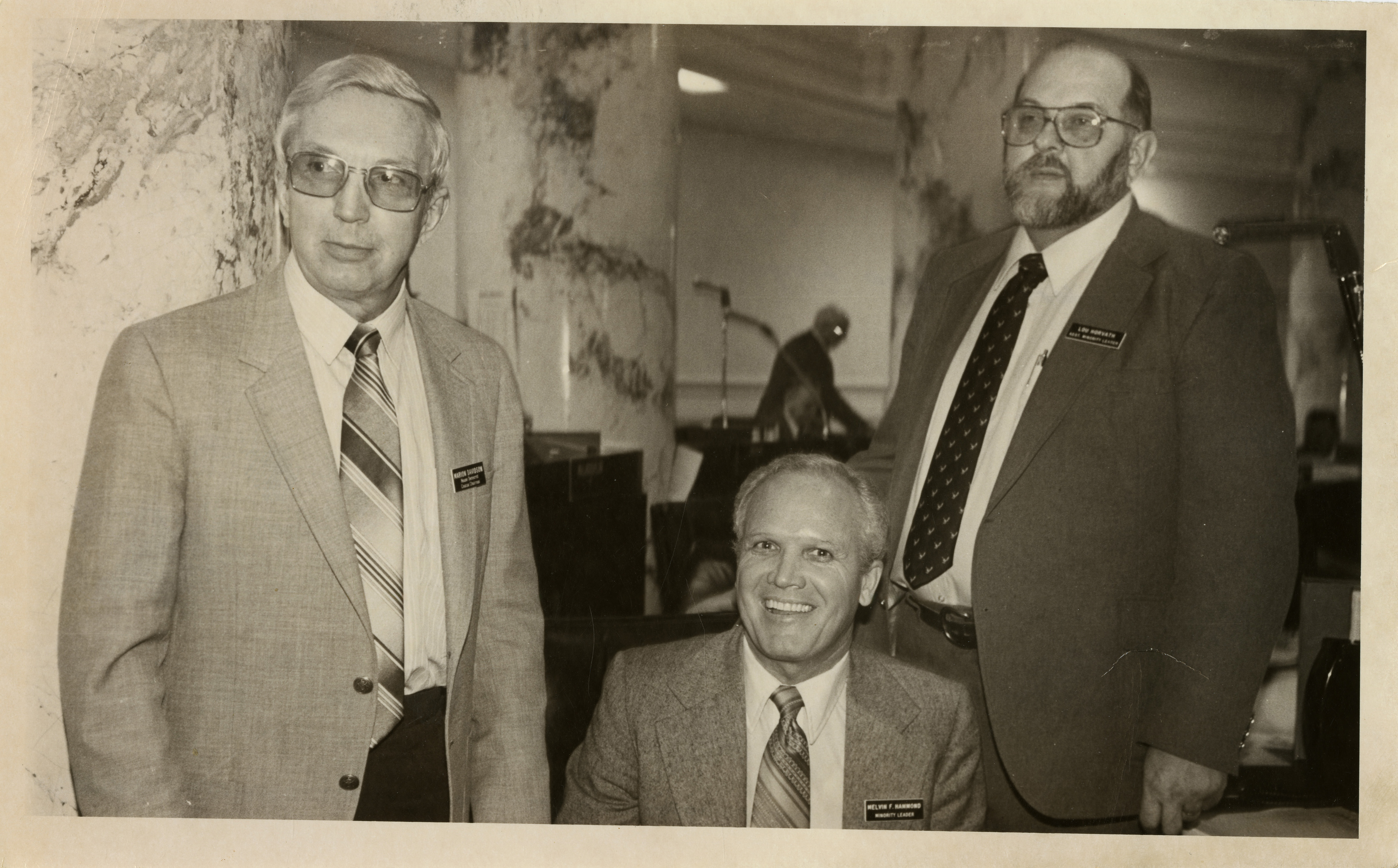 - House Democrat Caucus Chairman Marion Davidson, Minority Leader Melvin F. Hammod, and unknown are looking towards the left and smiling at the camera. Text back translation "Eastern Idaho Legislators"