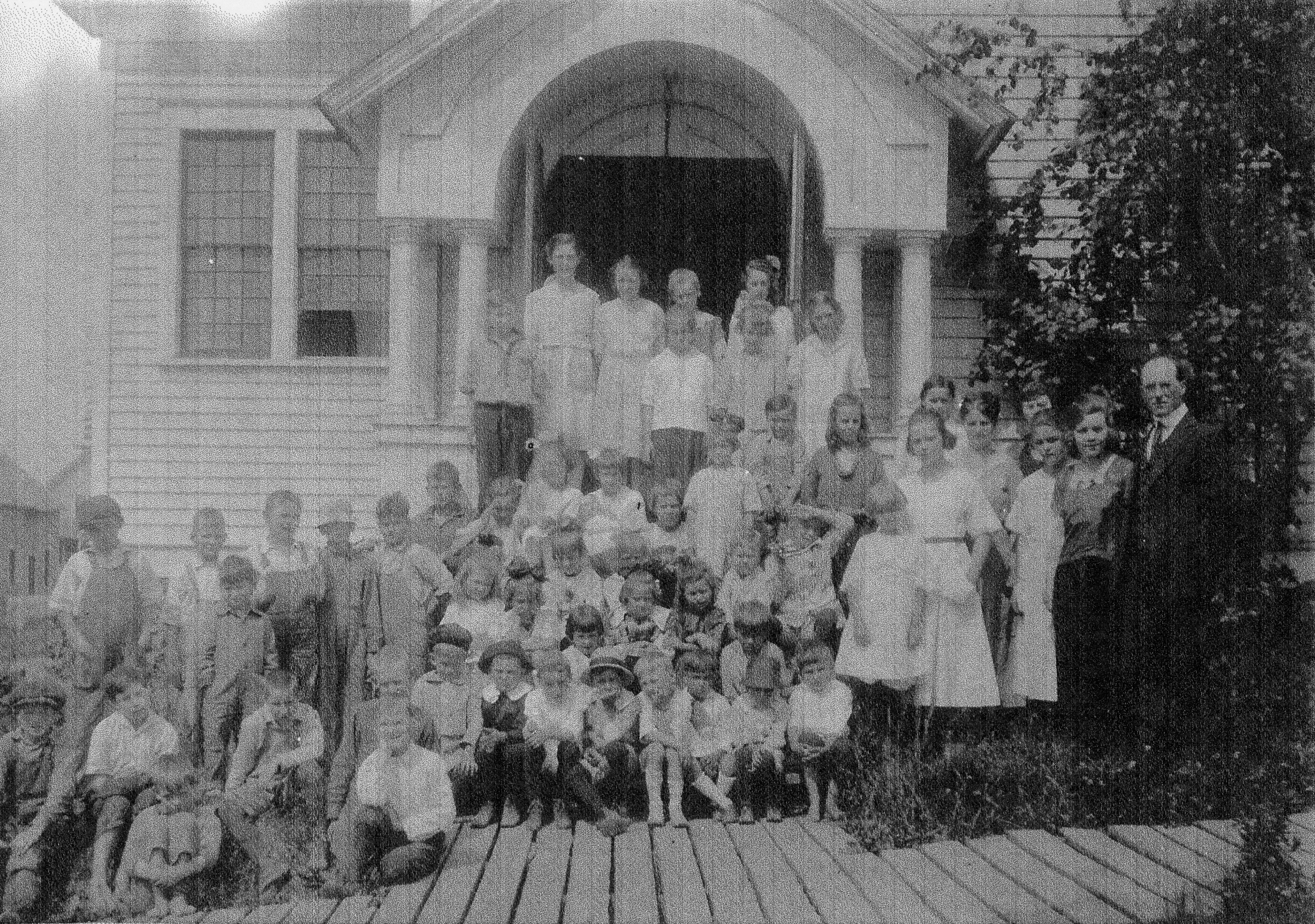 - A large group of children and a few adults standing on the steps of a building with a wooden walkway leading up to it. Vivienne Beardmore about 16 or 17 years stands at right side next to a man who is possibly the Congr. Church minister.