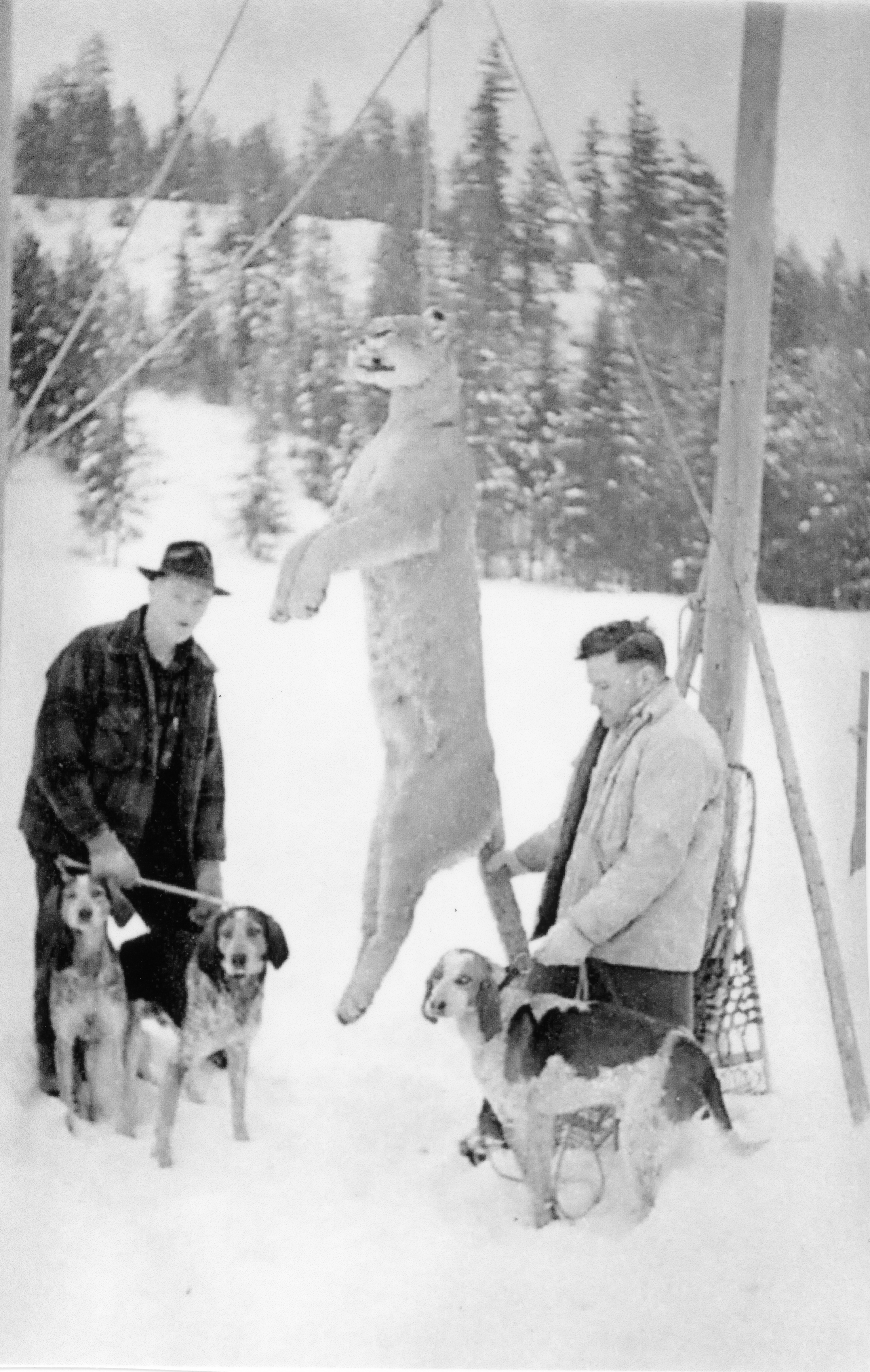 - Two men stand in a snowy landscape with trees in the background and cougar hanging from pole rigging.