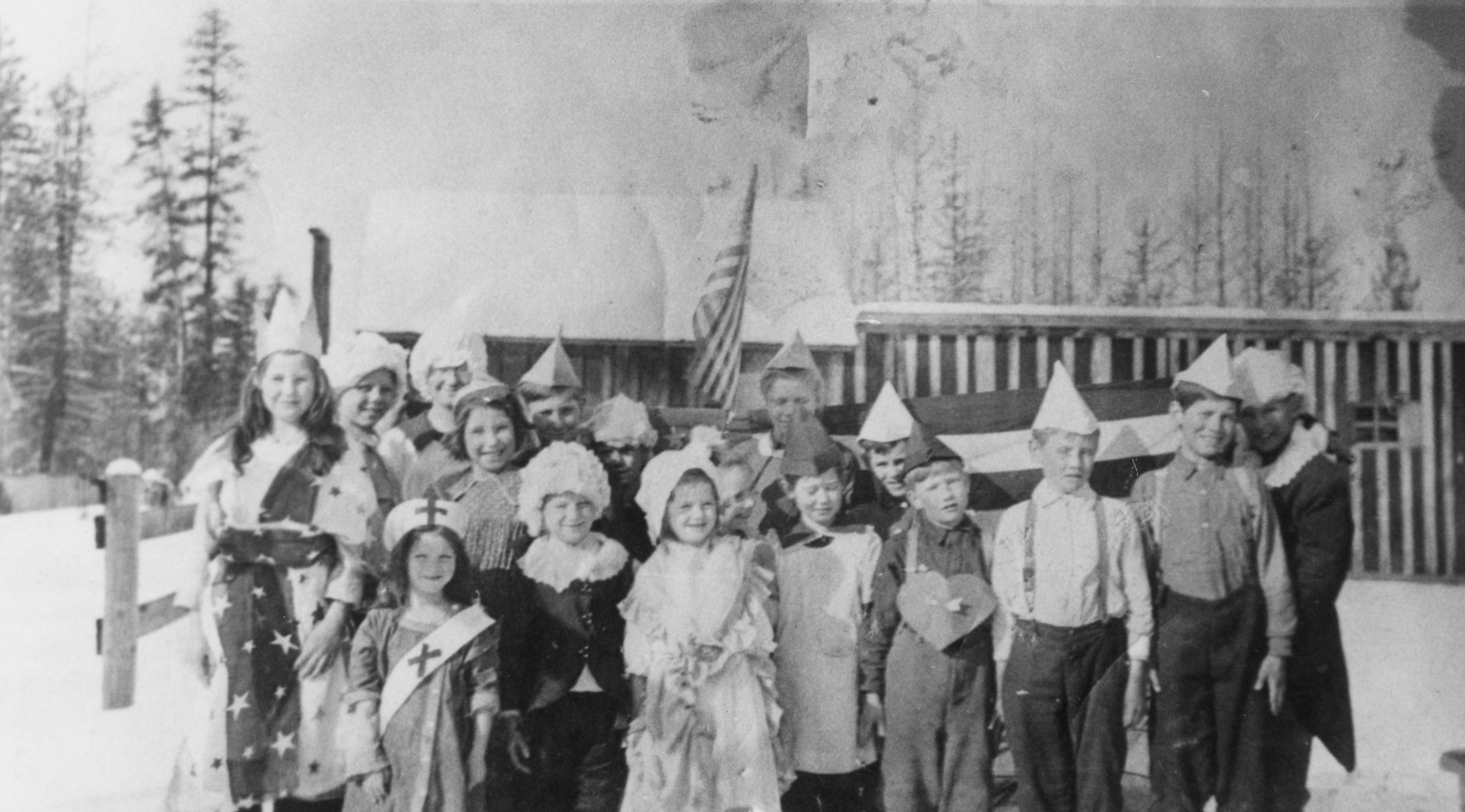 - Students lined up in front of school, dressed for a George Washington Program. American Flag in background, snow on ground. Children are Mildred Luce, Esther Pitts, Audrey Fiedler, Lorna Pitts, Earl Fiedler, Meek, Carl Pitts, Eva Apsitz, Edith Pitts, Anna Gugler, Howard Fiedler, Lawrence Gugler. Boy next to tall girl (Luce) on the left end was a Sloan.