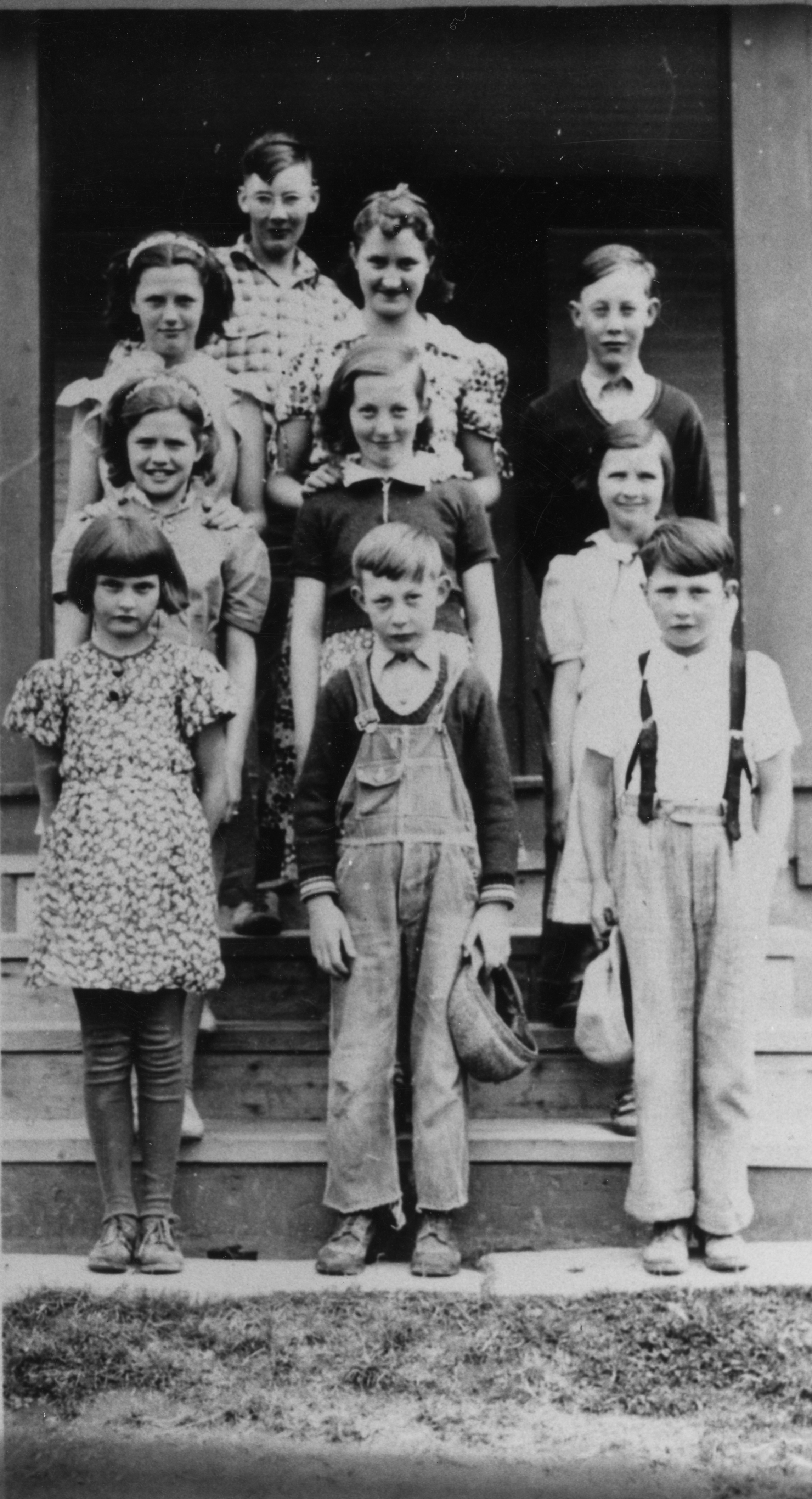 - Back Row: Milton Greene. 3rd Row: Patricia Fitzpatrick, Doris Harold, David Hirst. 2nd Row: Dorothy Jean Fitzpatrick, Marjorie Hirst (Tolbert), Iileen Medill. Front Row: Betty Harold, Larry Hirst, Raymond Harold Back of picture refers to Peninsula School.