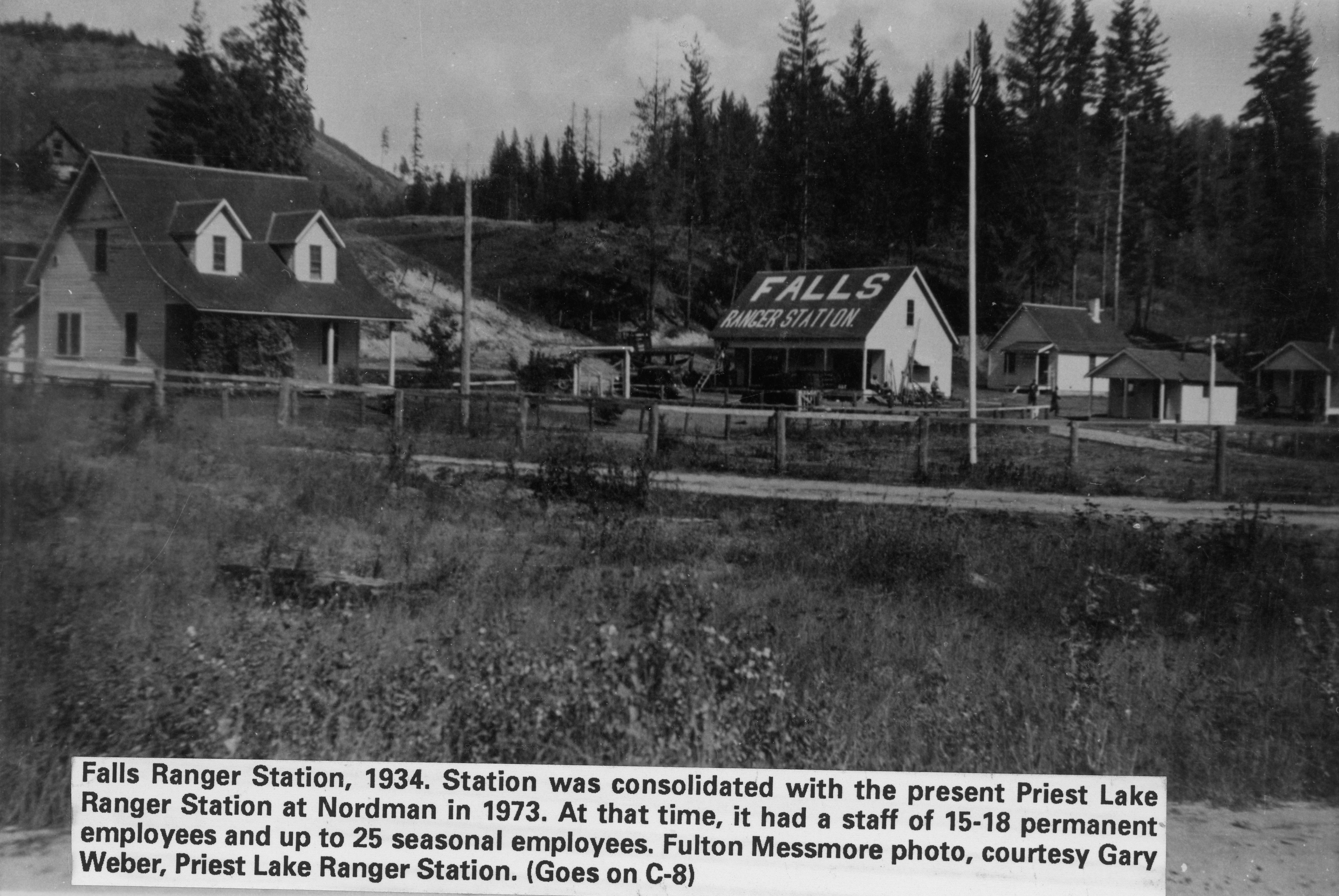 - A series of buildings with one house's roof bearing the word's "Falls Ranger Station". Caption at the bottom of the photograph reads: "Falls Ranger Station, 1934. Station was consolidated with the present Priest Lake Ranger Station at Nordman in 1973. At that time, it had a staff of 15-18 permanent employees and up to 25 seasonal employees. Fulton Messmore photo, courtesy Gary Weber, Priest Ranger Station. (Goes on C-8)".