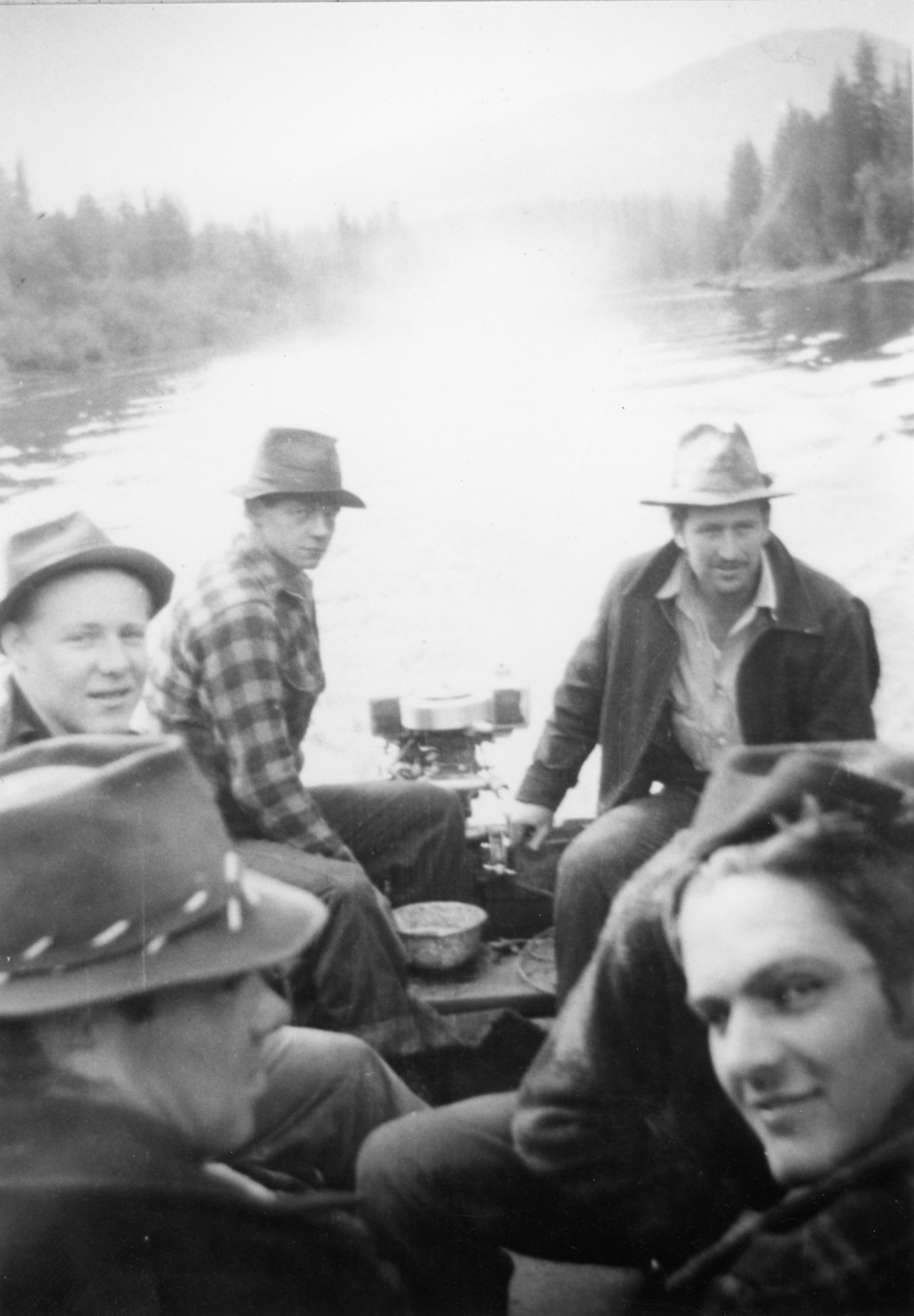 - A group of men wearing hats are sitting in a boat on a river, surrounded by trees and mountains in the background.