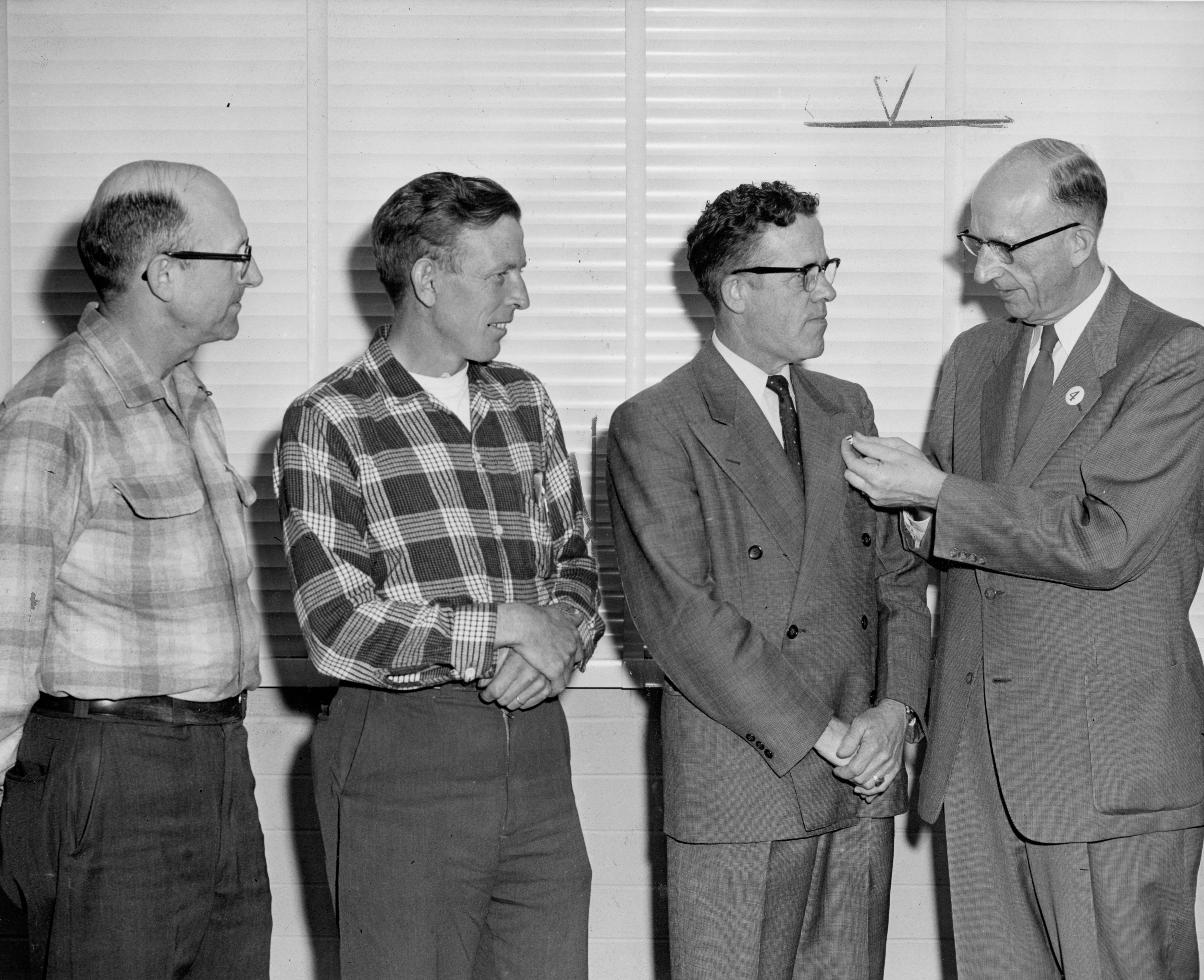 - Four men stand in a room with a window behind them: Glenn Rush, Bob Birke (?), Magnar Danielson, Al Peterson.