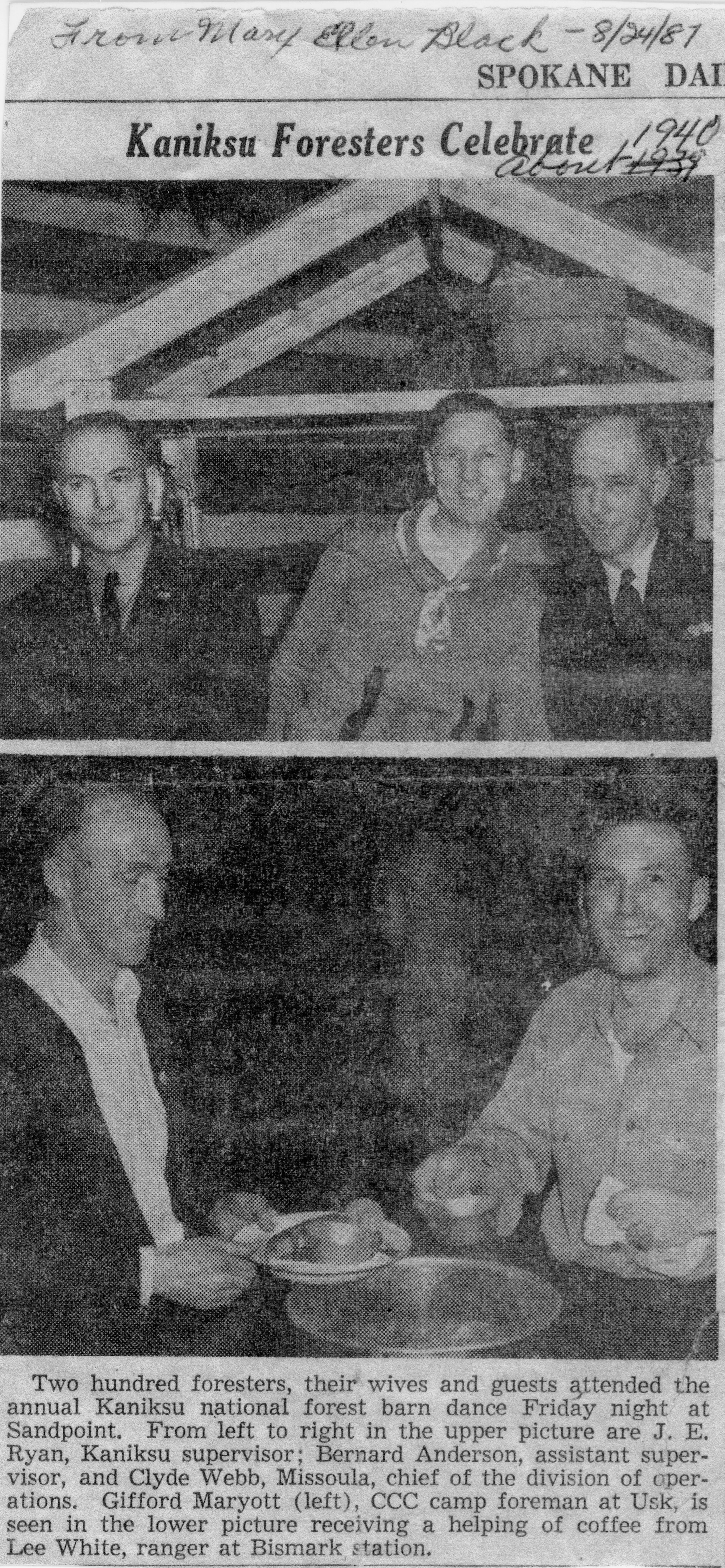 - Newspaper clipping from Spokane Daily News, August 24, 1981. Text reads: "Two hundred foresters, their wives and guests attended the annual Kaniksu National Forest barn dance Friday night at Sandpoint. From left to right in the upper picture are J.E. Ryan, Kaniksu Supervisor, Bernard Anderson, Assistant Supervisor, and Clyde Webb, Missoula, Chief of the division of operations. Gifford Maryott (Left), CCC camp foreman at Usk, is seen in the lower picture receiving a helping of coffee from Lee White, Ranger at Bismark Station."