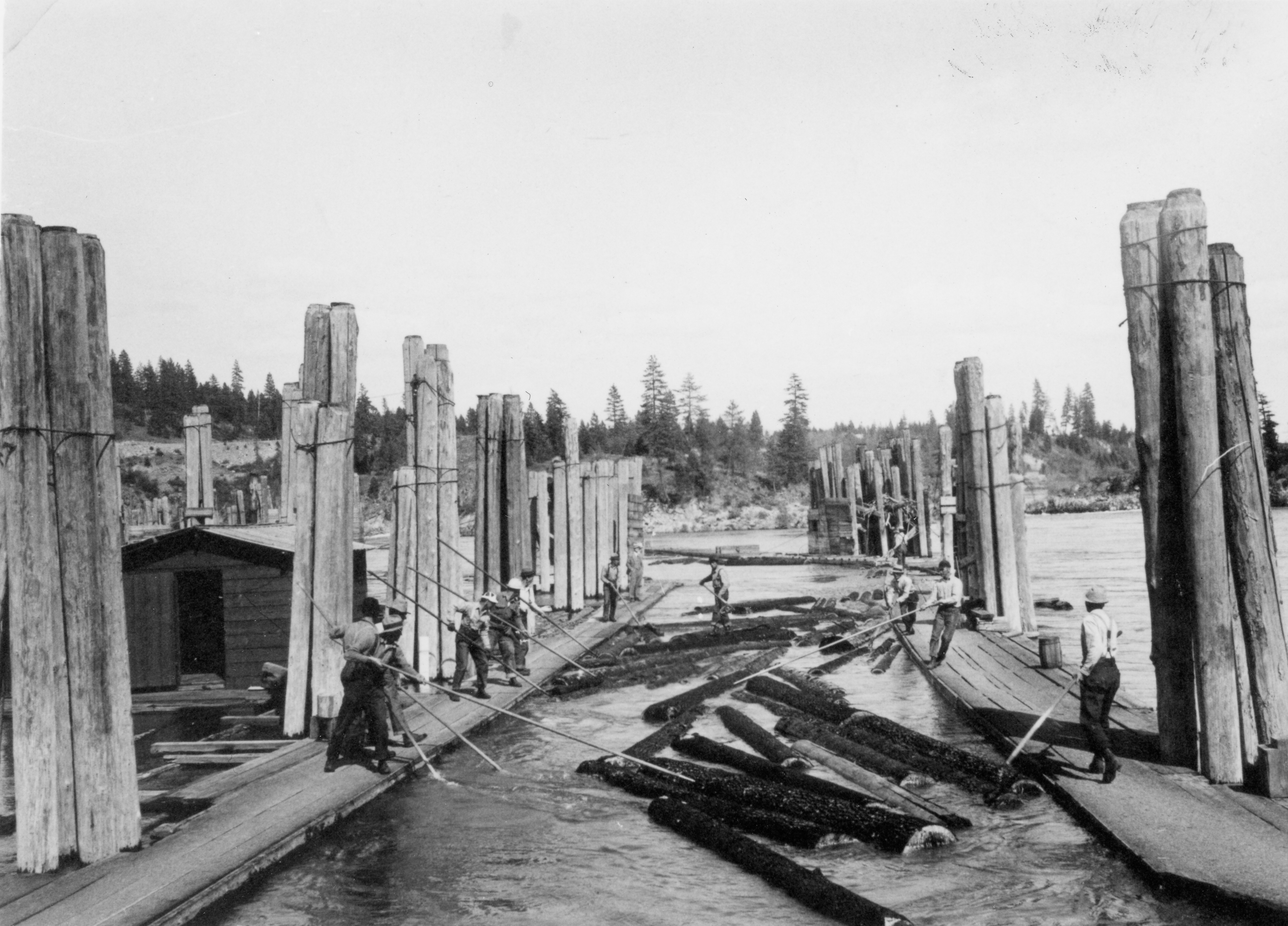 - A group of men stand on wooden platforms using long poles to guide logs at the Sorting Gaps on the Pend Oreille River.