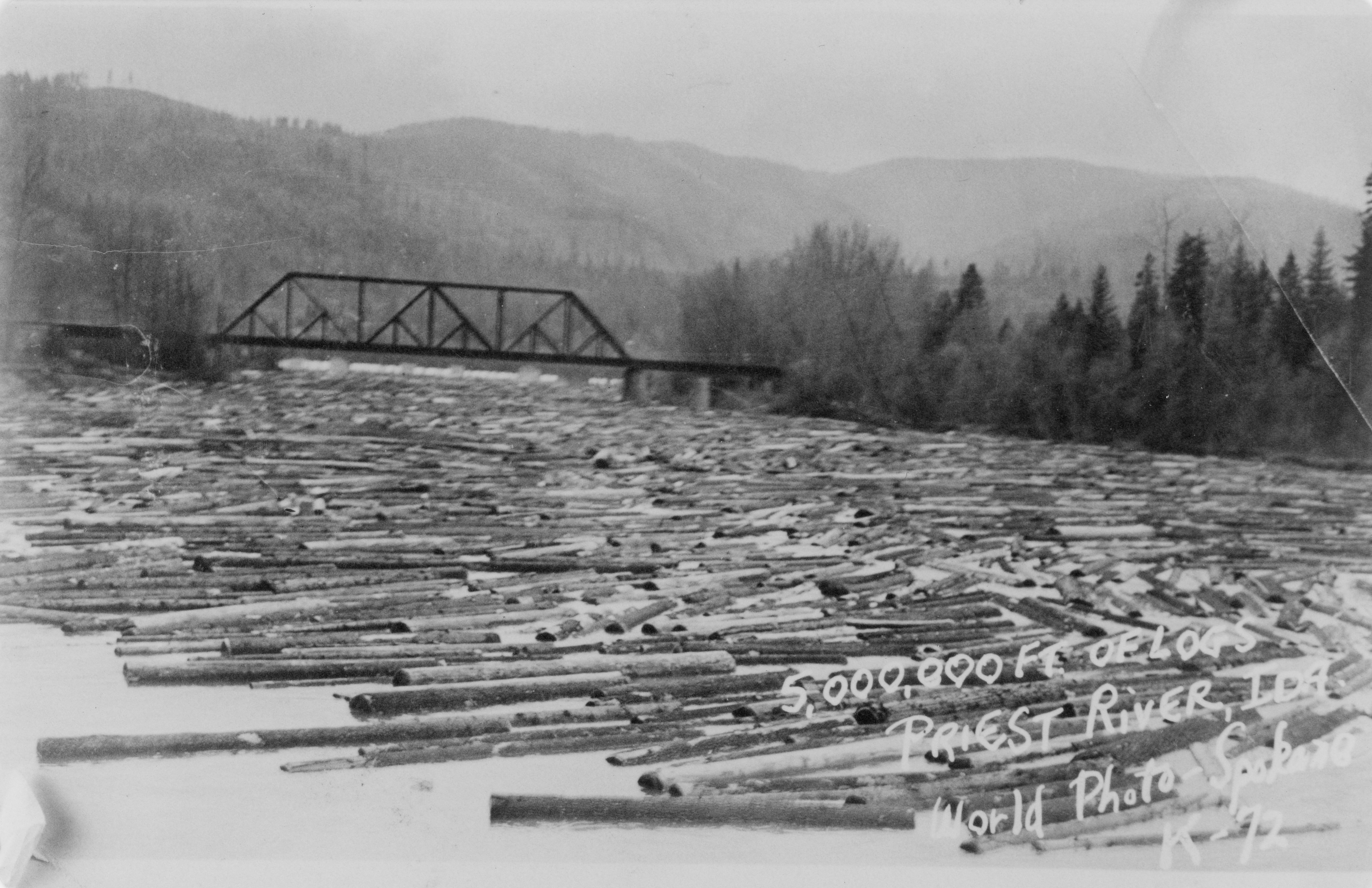 - Logs densely packed in a river with a metal bridge spanning across in the background. Writing on the bottom of photo reads: "5,000,000 Ft. of Logs, Priest River Ida. World Photo Spokane K-72".