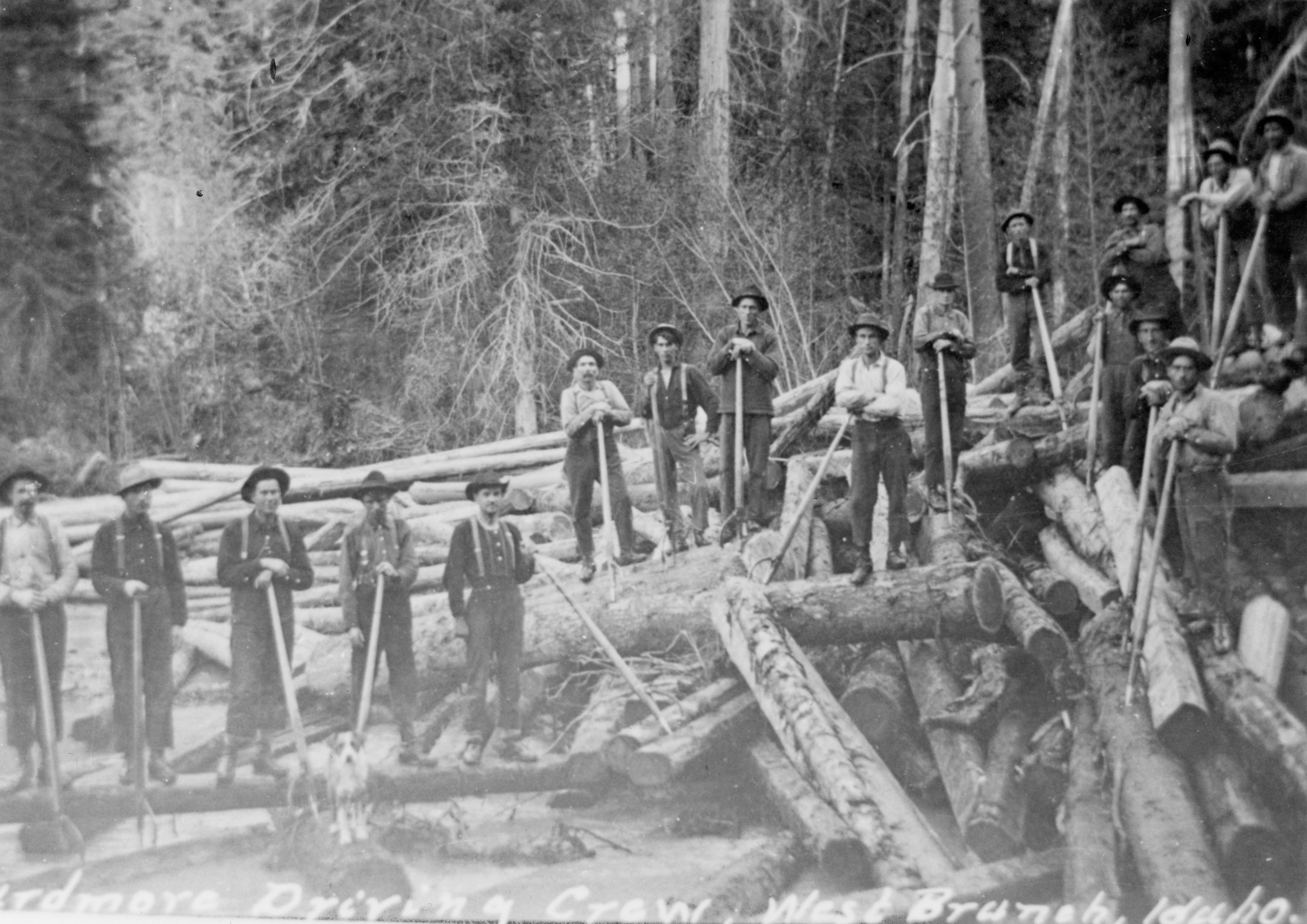 - "Beardmore Driving Crew, West Branch Idaho" standing on and around a pile of logs in a forest holding cant hooks.