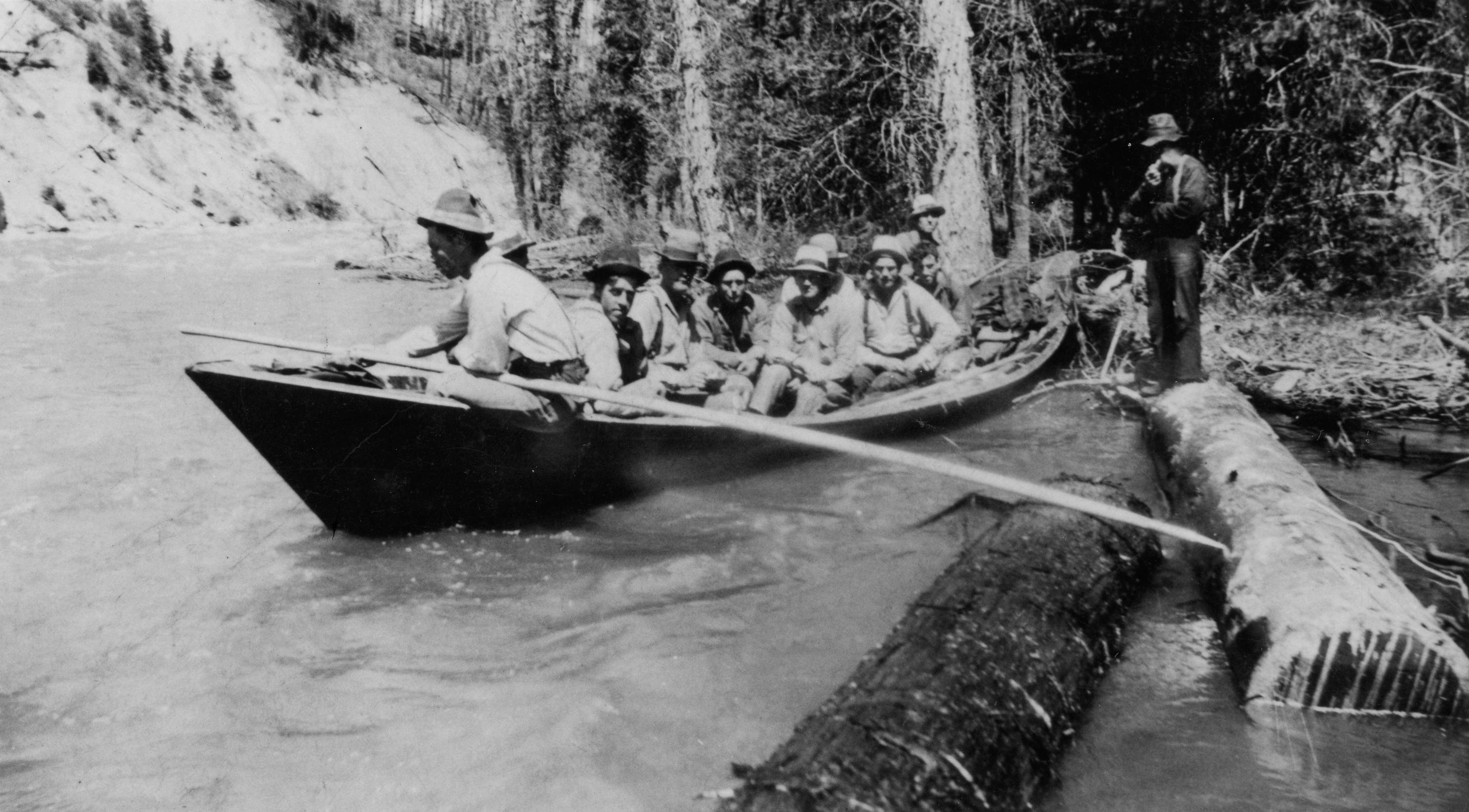 - A group of people sitting in a canoe on a river, with one person standing on a log nearby.