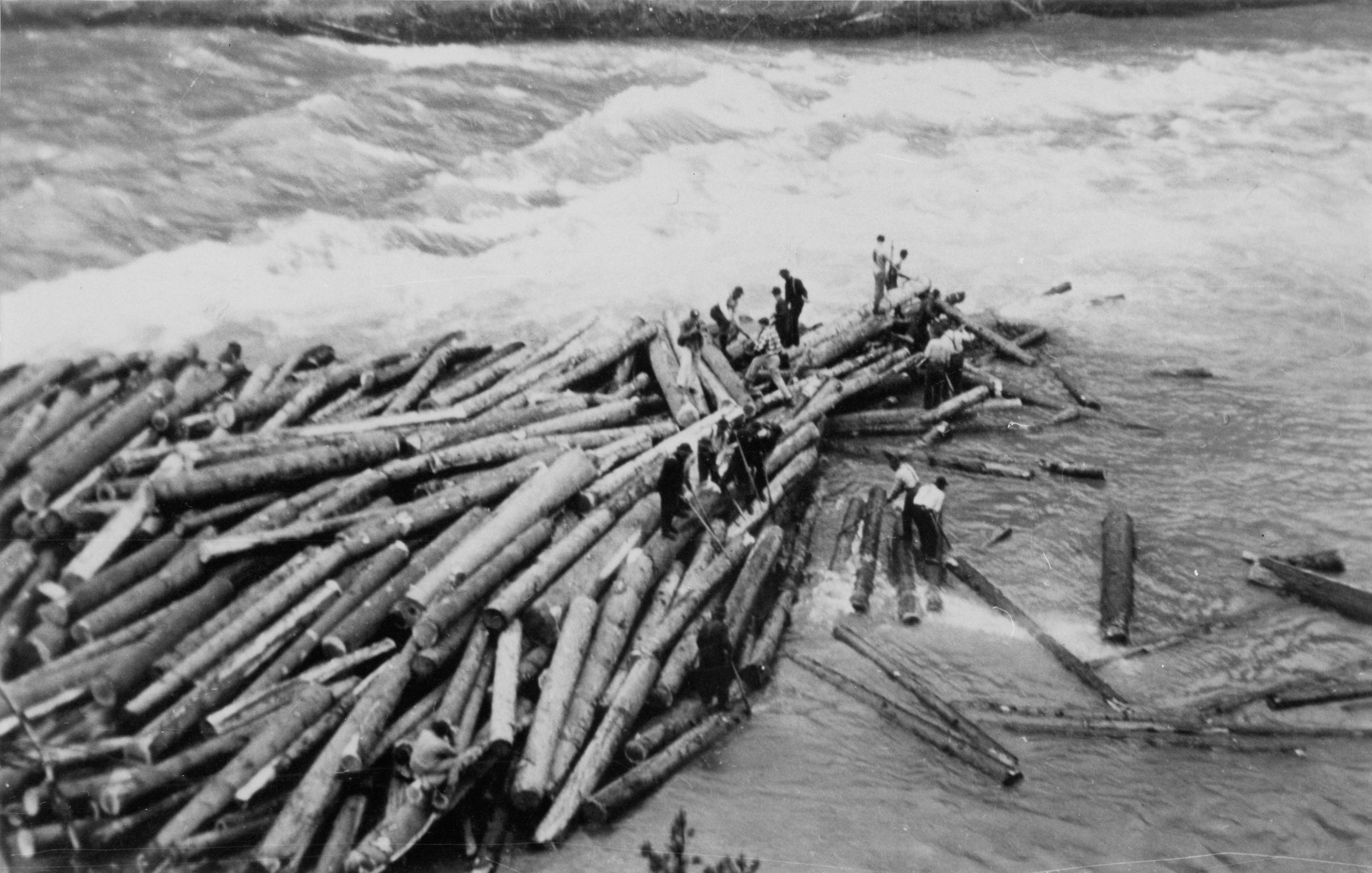 - Red Rouse and unknown workers on a log drive.