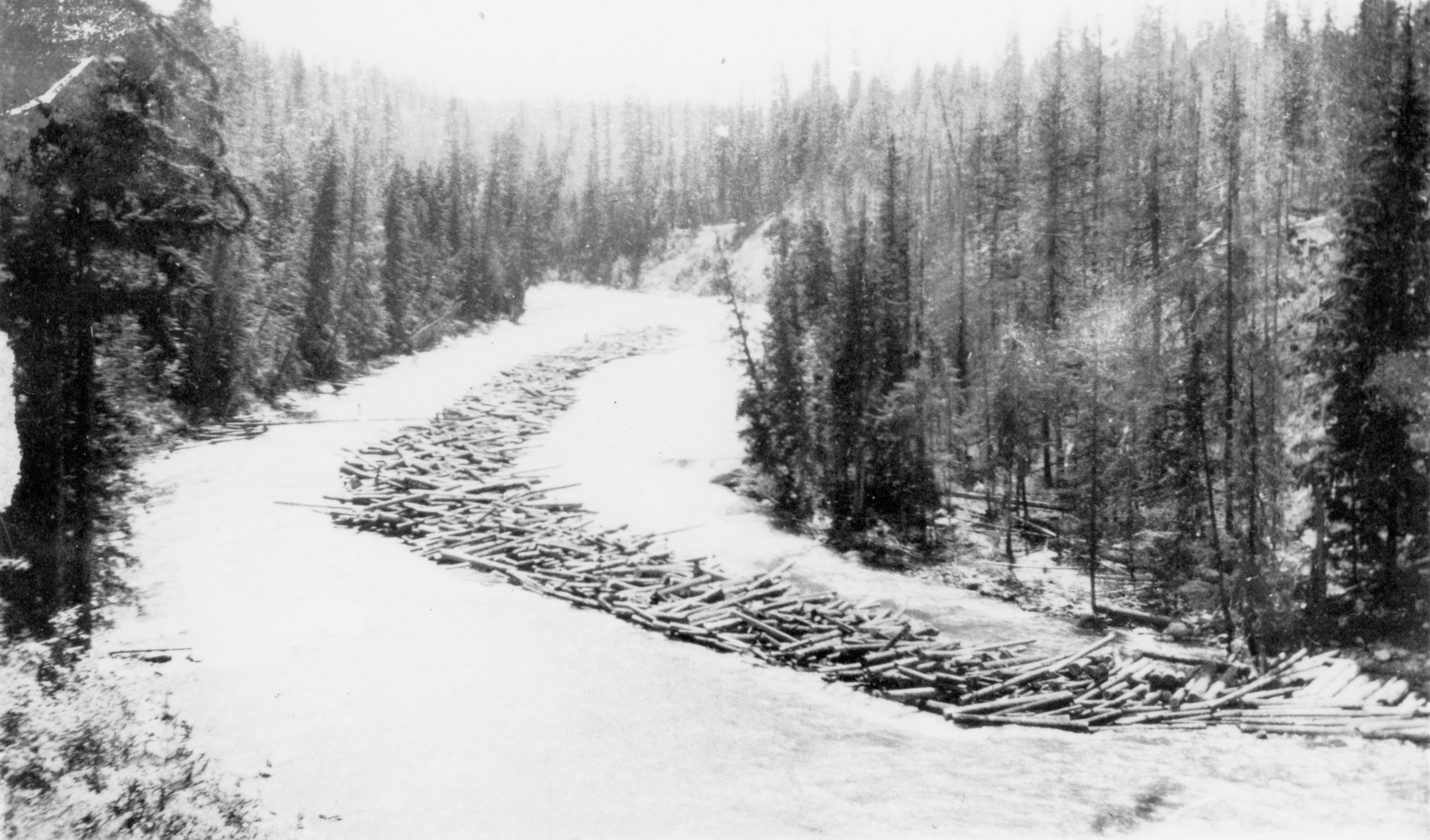 - Photo shows log jam in the center of a river.
