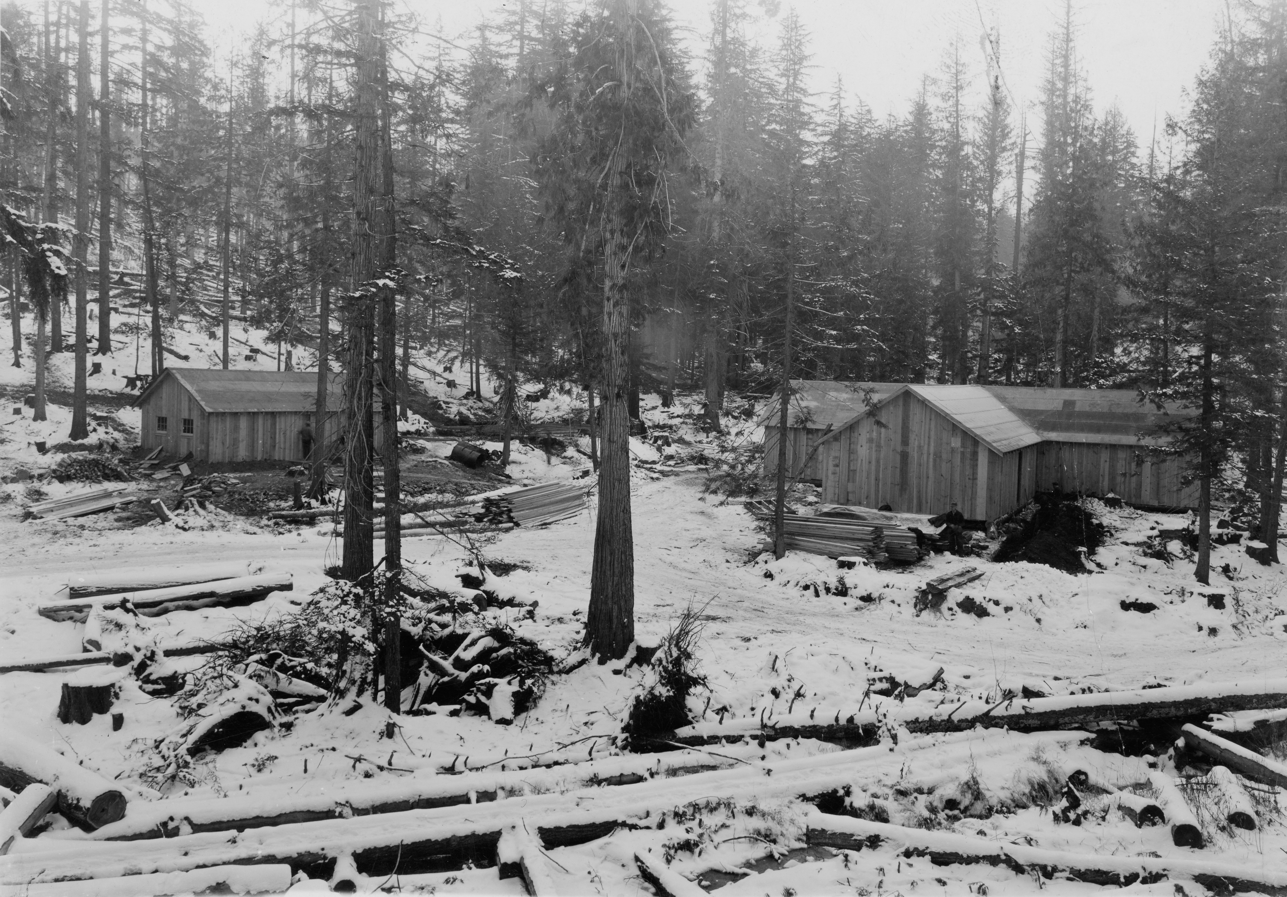 - Two wooden cabins surrounded by a snowy forest landscape. Logs and piles of timber are scattered on the ground.