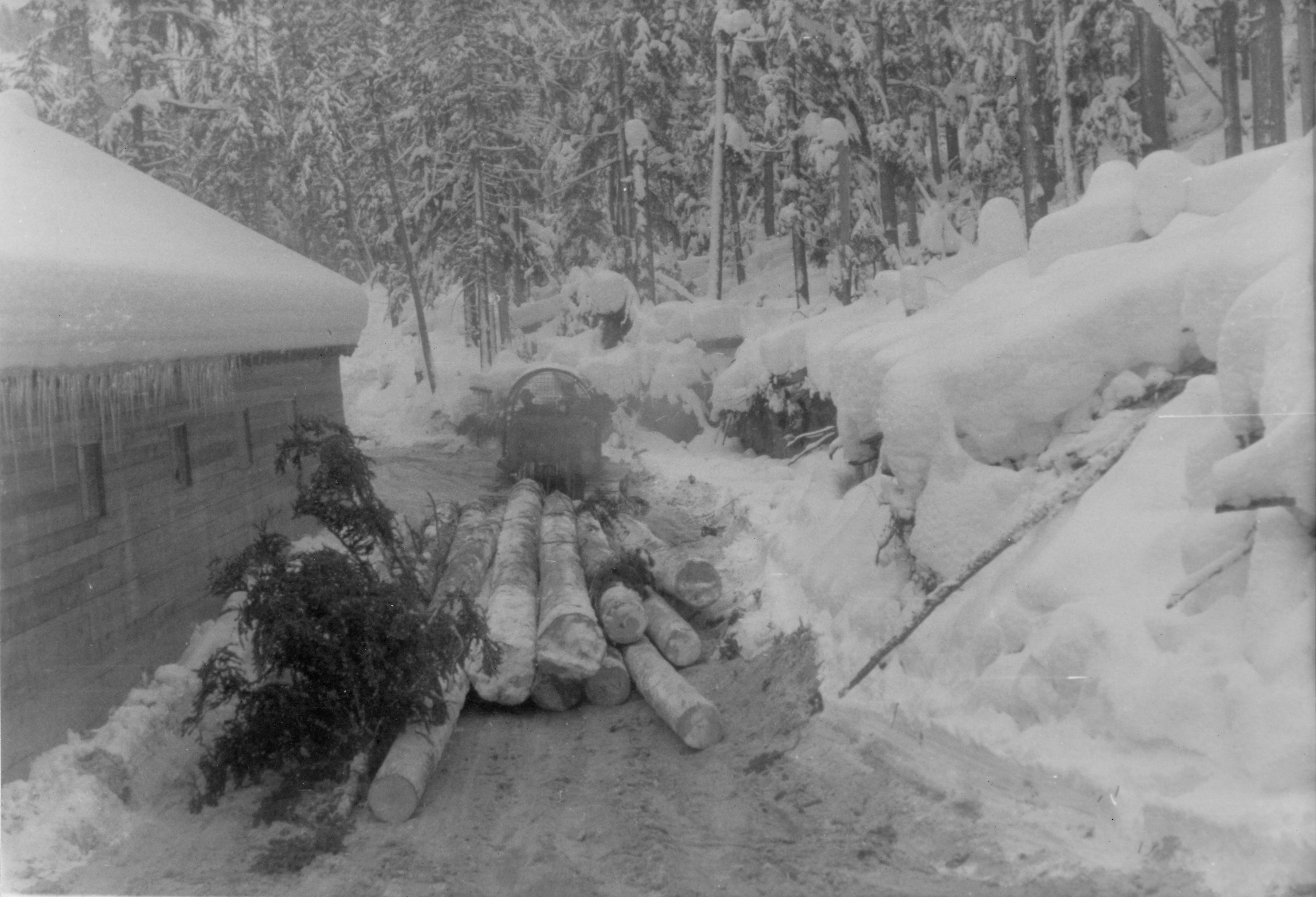 - A vehicle on a snowy path pulling a group of logs beside a cabin.