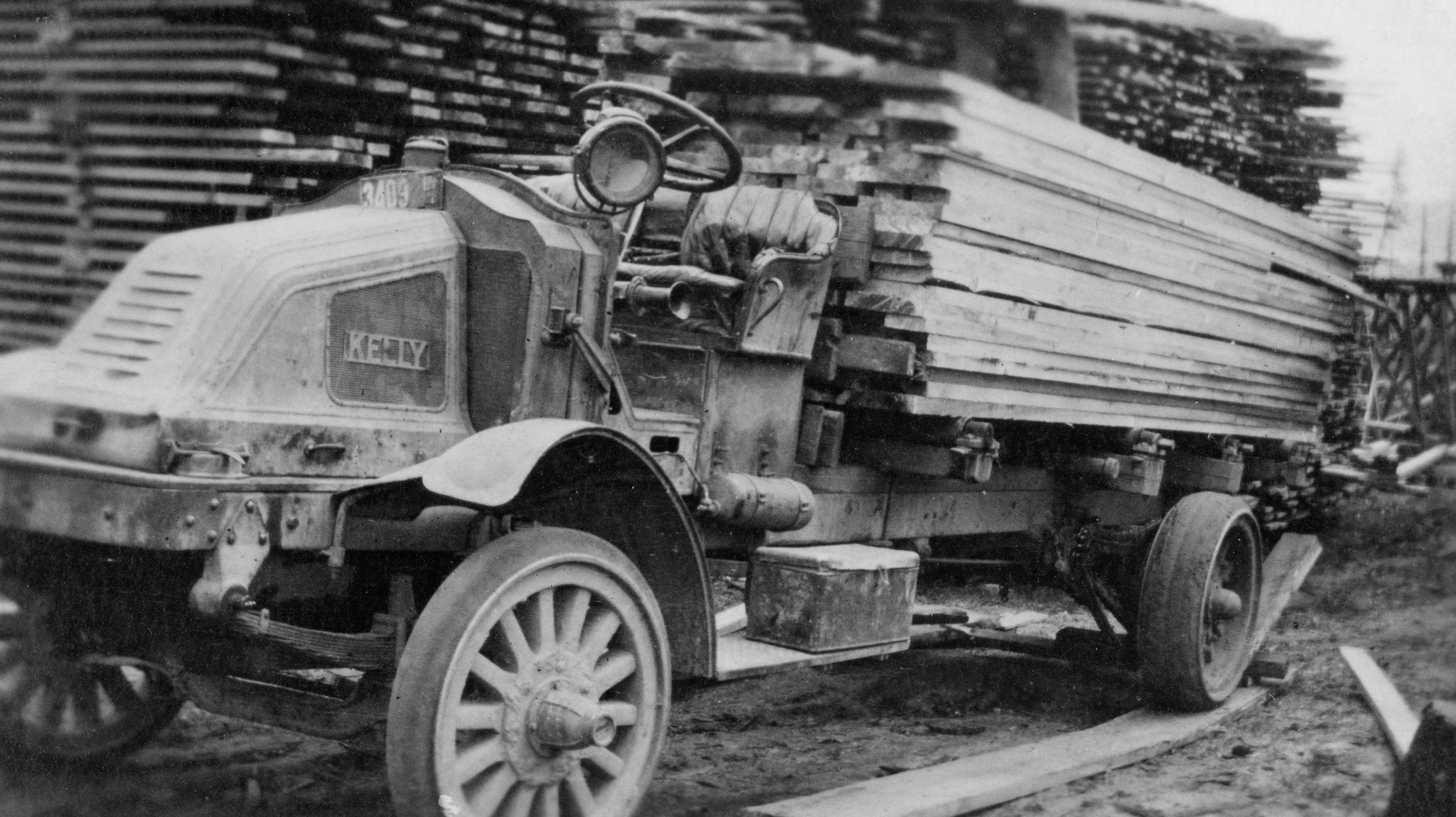 - Load of lumber on a Kelly Springfield truck which Howard Peterson drove in Samuels, ID. The text "Kelly" and "3409" are written on the vehicle.