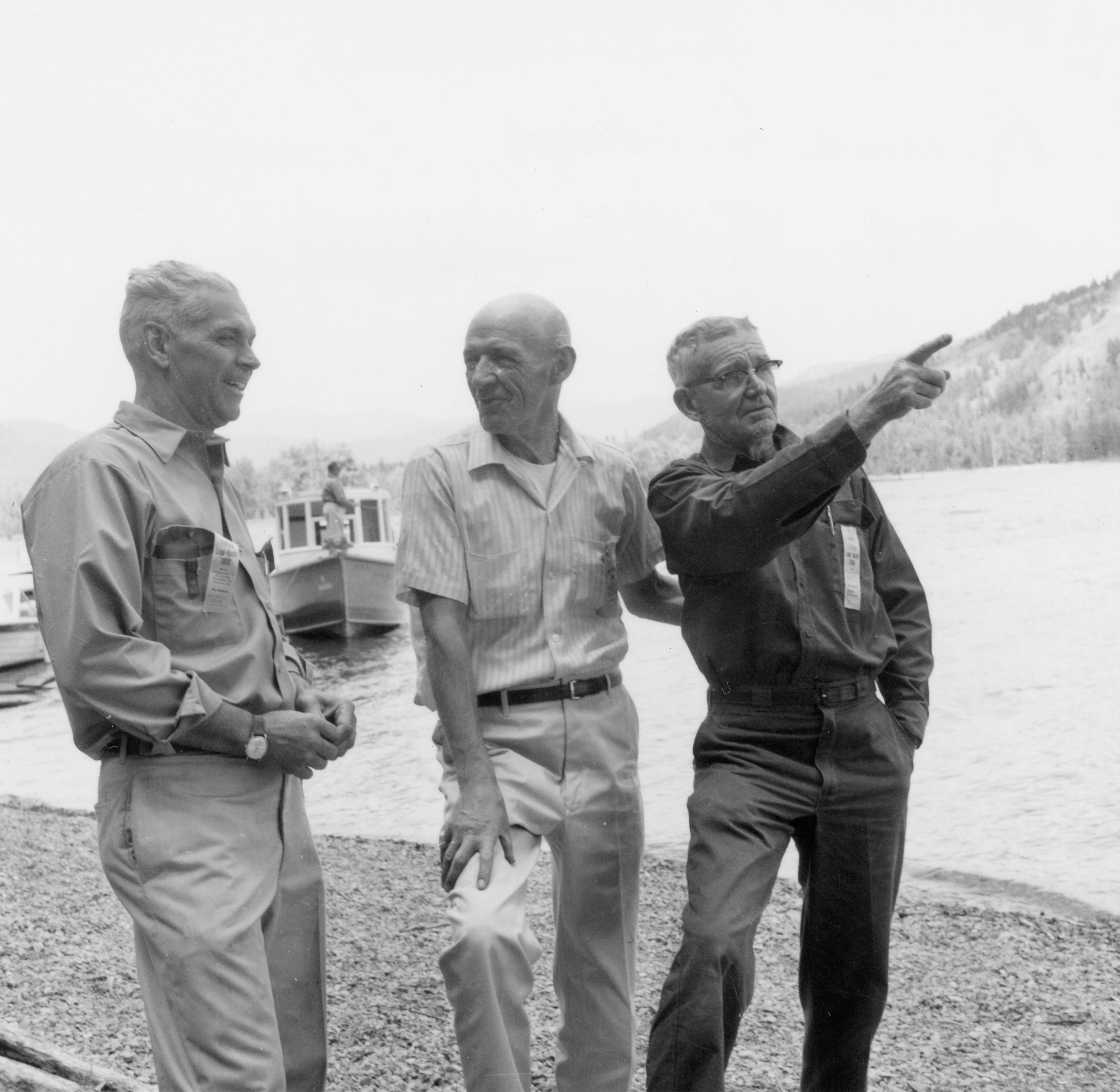- Russ Bishop, Leonard Luby and Tom Moar standing together on a pebbled shore by the water.