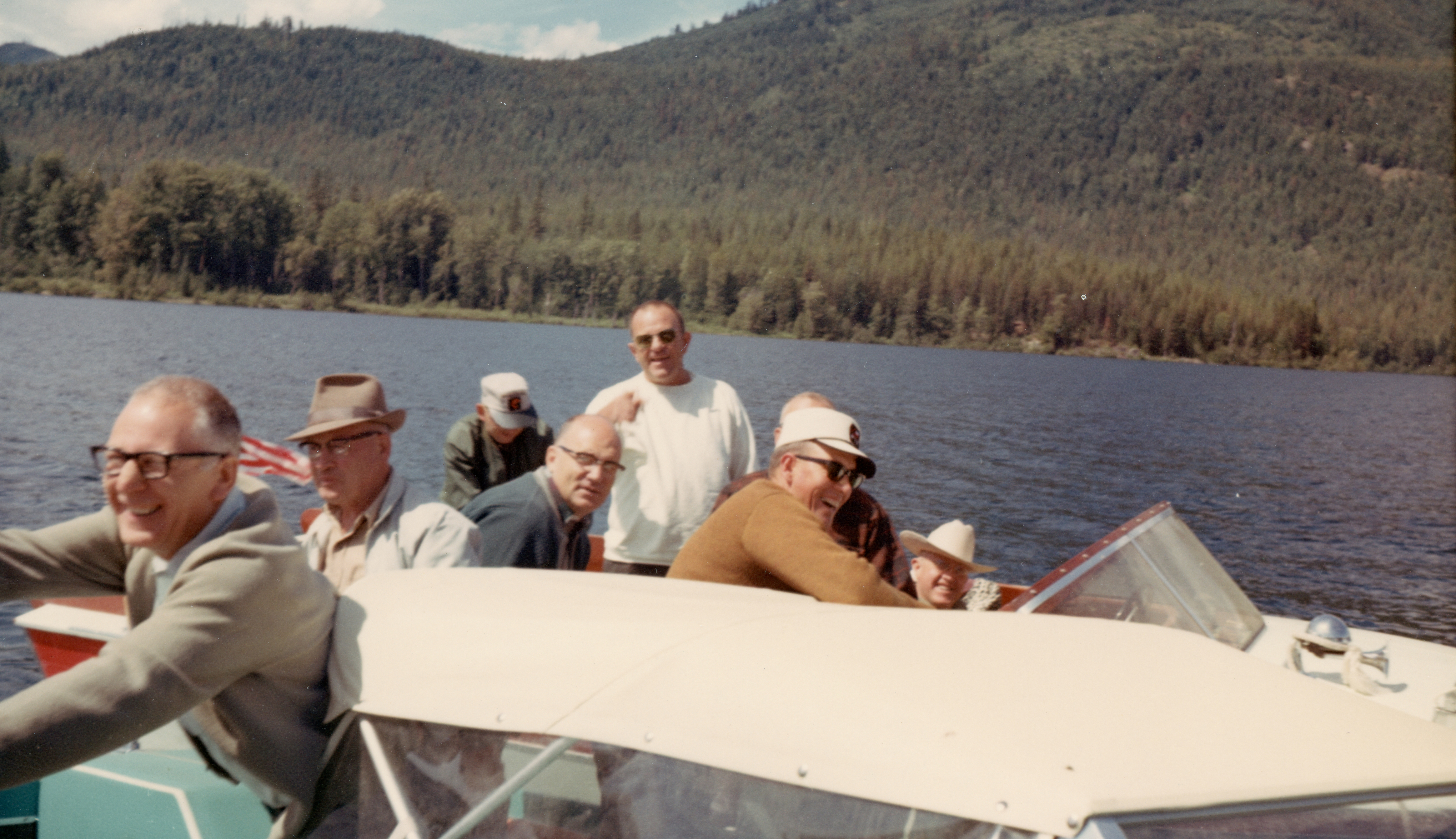 - A group of men is gathered in a boat on a lake, with a forested hillside in the background On Upper Priest Lake during the Priest Lake Timber Protection Association Land Board Tour. Left to right: Rauch, Doolittle, Gillette, Trombley, Strayfeller, Burns, Cochran (hidden), Chatburn
