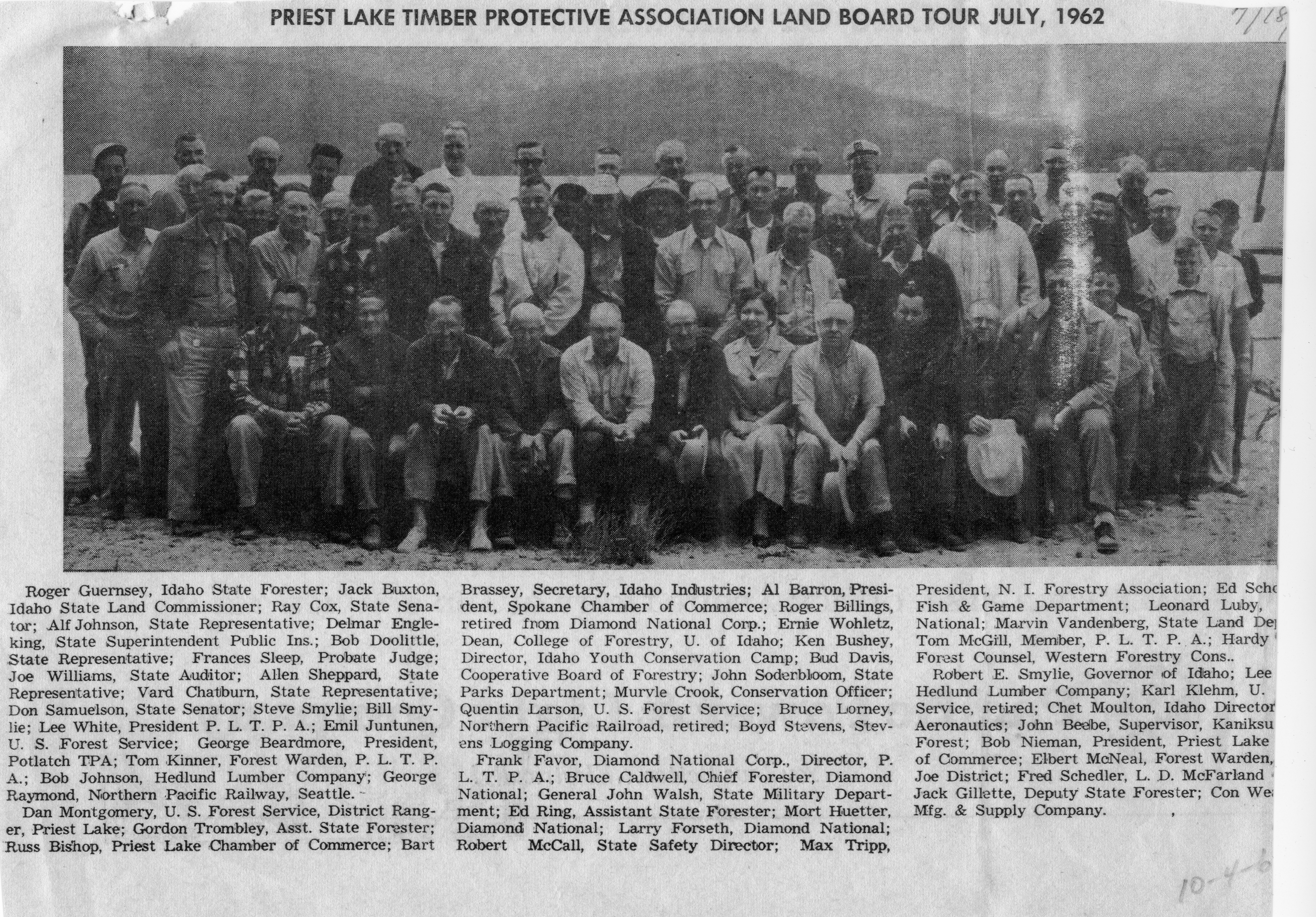 - Newspaper photo of Priest Lake Timber Protective Association Land Board Tour July 1962. Typed text: Top Section: PRIEST LAKE TIMBER PROTECTIVE ASSOCIATION LAND BOARD TOUR JULY, 1962. Bottom Section (names and titles): Roger Guernsey, Idaho State Forester; Jack Buxton, Idaho State Land Commissioner; Ray Cox, State Senator; Alf Johnson, State Representative; Delmar Engleking, State Superintendent Public Ins.; Bob Doolittle, State Representative; Frances Sleep, Probate Judge; Joe Williams, State Auditor; Allen Sheppard, State Representative; Ward Chatburn, State Representative; Sam Sansevios, State Senator; Steve Smylie; Bill Smylie; Lee While, President P.L.T.P.A.; Emil Juntunen, U.S. Forest Service; George Beardmore, President, Kaniksu TPA; Tom Kinner, Forest Warden, P.L.T.P.A.; Bob Johnson, Hedlund Lumber Company; George Brassey, Secretary, Idaho Industries; Al Barron, President, Spokane Chamber of Commerce; Roger Billings, retired from Diamond National Corp.; Ernie Wohletz, Dean, College of Forestry, U. of Idaho; Ken Bushey, Director, Idaho Youth Conservation Camp; Bud Davis, Cooperative Board of Forestry; John Soderbloom, State Parks Department; Murvle Crook, Conservation Officer; Quentin Larson, U.S. Forest Service; Bruce Lomey, Northern Pacific Railroad, retired; Boyd Stevens, Stevens Logging Company; Dan Montgomery, U.S. Forest Service, District Ranger, Priest Lake; Gordon Trombley, Asst. State Forester; Russ Bishop, Priest Lake Chamber of Commerce; Bart Frank Favor, Diamond National Corp., Director, P.L.T.P.A.; Bruce Caldwell, Chief Forester, Diamond National; General John Walsh, State Military Department; Ed Ring, Assistant State Forester; Mort Huetter, Diamond National; Larry Forseth, Diamond National; Robert McCall, State Safety Director; Max Tripp, President, N.I. Forestry Association; Ed Schooler, Fish & Game Department; Leonard Luby, Diamond National; Marvin Vandenberg, State Land Department; Tom McGill, Member, P.L.T.P.A.; Hardy, Forest Counsel, Western Forestry Cons.; Robert E. Smylie, Governor of Idaho; Lee Hedlund Lumber Company; Karl Klehm, U.S. Forest Service, retired; Chet Moulton, Idaho Director Aeronautics; John Beebe, Supervisor, Kaniksu Forest; Bob Nieman, President, Priest Lake Chamber of Commerce; Elbert McNeal, Forest Warden, Joe District; Fred Schedler, L.D. McFarland; Jack Gillette, Deputy State Forester; Con Wead, Mfg. & Supply Company. Handwritten text: Near Top Right: 7/18, Bottom Right Corner: 104.