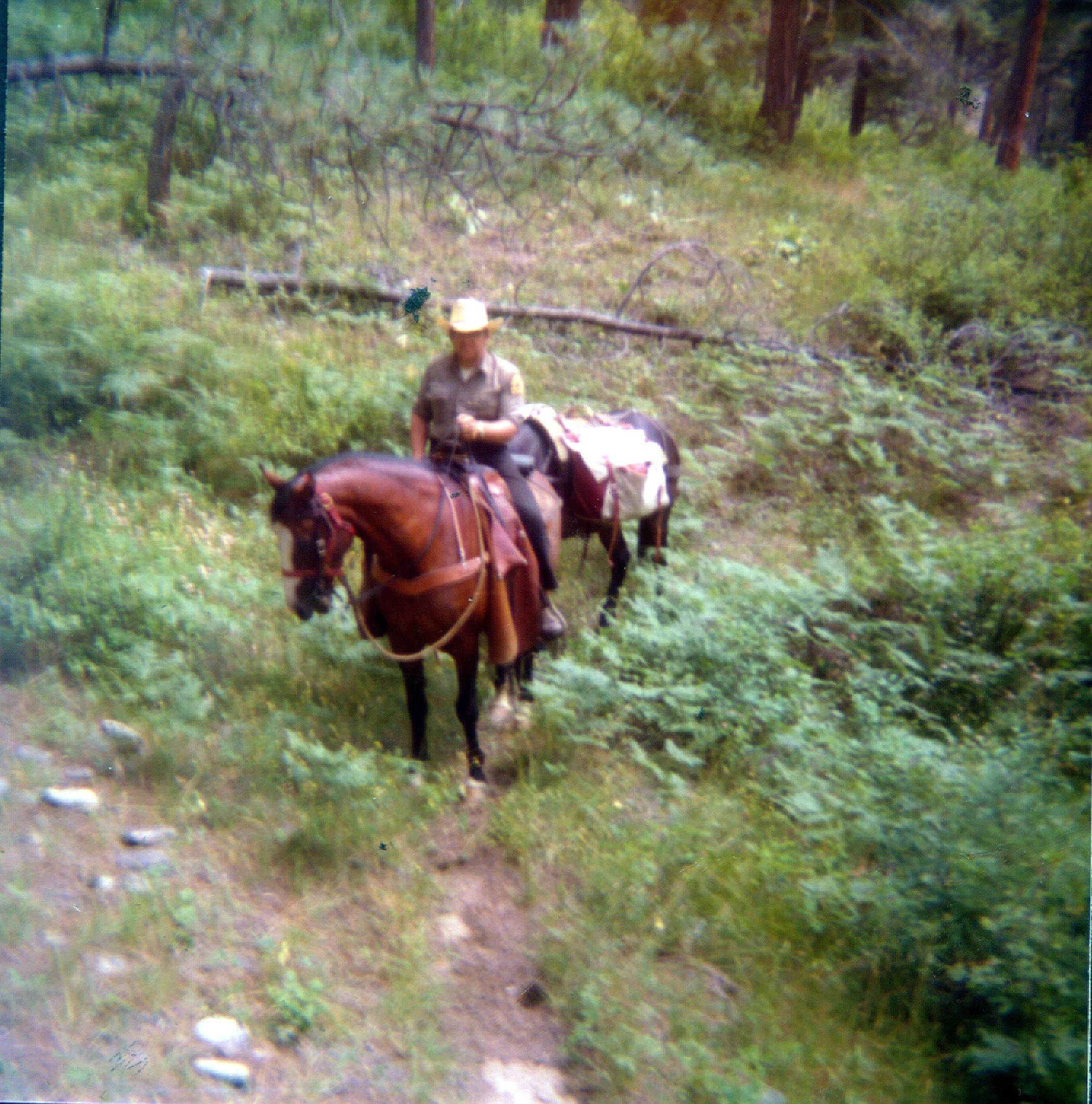 AS: Well the portals were Elk Summit up at Lost Horse, Moose Creek and Selway Falls. Those were the primary portals where we had staff and of course we had people on the West Fork District up at Paradise and again we were trying to provide people with information, we were trying to be friendly......we were at the same time trying to teach some different methods of using the wilderness that were low impact. We came up with a booklet that we handed out that had all kinds of interesting information trivia about experiencing Moose Creek, stories of Moose Creek, but within all those was the educational message on no-trace camping. One of the things we did, in the fall of the year for example, we had a lot of hunters. Hunters were the primary users in the fall, backpackers in the summer and to some extent floaters on the river. Although there are use levels because we were managing that river for a very low density of use. A maximum of opportunity and a minimum of regulation is what we were after. So primitive and unconfined and nothing is more confining than regulations. So we tried to keep the regulations to a minimum but the use levels were low enough that people could travel at their own pace. They didn't have to stay at a particular camp ground. If they wanted to do the trip in 3 days they could, if they wanted to do it in 10 days they could. Cause it was again, primitive and unconfined. But we wanted them again to know how to make that trip with a minimum impact. A lot of our impact was coming from livestock in the fall during hunting season so our wilderness rangers were out there with their backpacks, backpacking around the district and talking to these hunters that were there with horses and mules and the hunters would nod and say "uh-huh. ok." and then continue to do exactly what they were doing because the wilderness rangers didn't have any credibility with them. So we thought, we really had a neat group of people, the wilderness rangers, the whole crew, the trail crews, and then we had Emil and Penny Keck and Barry Hicks and Larry Cown as fire control people and Jim Bradley was my resource assistant in recreation and Jim was a very forward thinking person, a very creative person. We would get our heads together and say "Ok, we have a problem. How can we solve it? and we don't want to confine ourselves to policy and the way we've done it in the past we want it to look forward. How can we solve these problems in a creative but effective way?" The main thing was to be effective. So I decided we were going to put all of our wilderness rangers on horseback in the fall. So we gave them each a horse and a mule and they were dead against it. They didn't want anything to do with it because that horse and mule was more impact and they didn't want to make any more impact. I told 'em to shut up. We had a school where we taught them basics of horsemanship and packing and then we turned them loose out in the field. Well when they'd go into a hunting camp then, they'd come in with their horse and their mule. They immediately took to those animals and you couldn't pry the animals away from them by the end of the first season. They loved their horse and mule. They were challenged with the whole thing about packing. About how to deal with ropes, how to tie them to a hitch, how to do this or that dealing with packing so if they went into a camp and maybe one of the people there had a horse that was really outfitted well or a pack saddle that was really outfitted, maybe a fancy finish on a rope they'd say "How do you do that?" Well then ya know the hunter would just sit down and show them how he did it and pretty soon they were actually talking and they were communicating. We began to have a lot more impact as far as being able to minimize the impact of the hunters in the fall. We were also in the critical part of getting our outfitters into light-weight gear. We had some camps that were really elaborate camps where the equipment stayed year after year and they were really big, basically permanent camps. Al Defler actually started a process of getting them converted to light-weight gear. We did a lot of work with the Missoula Equipment Development Center on developing light-weight gear that these folks could use that would serve their need but was easy to pack in and easy to pack out so in the fall they'd take everything with them.