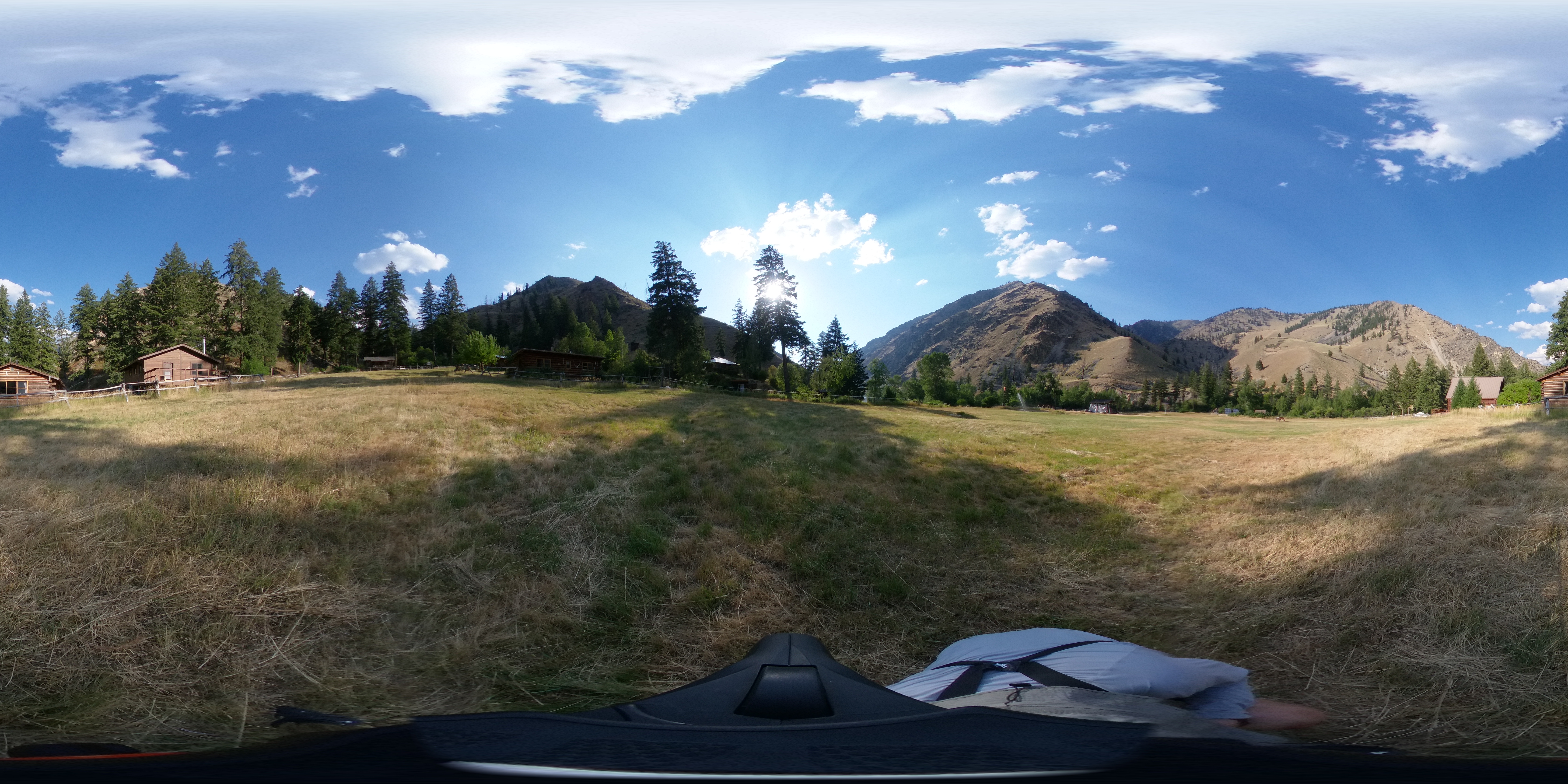 - Full panorama of Taylor hay pasture with surrounding cabins and mountains in background, including Horse Mountain.
