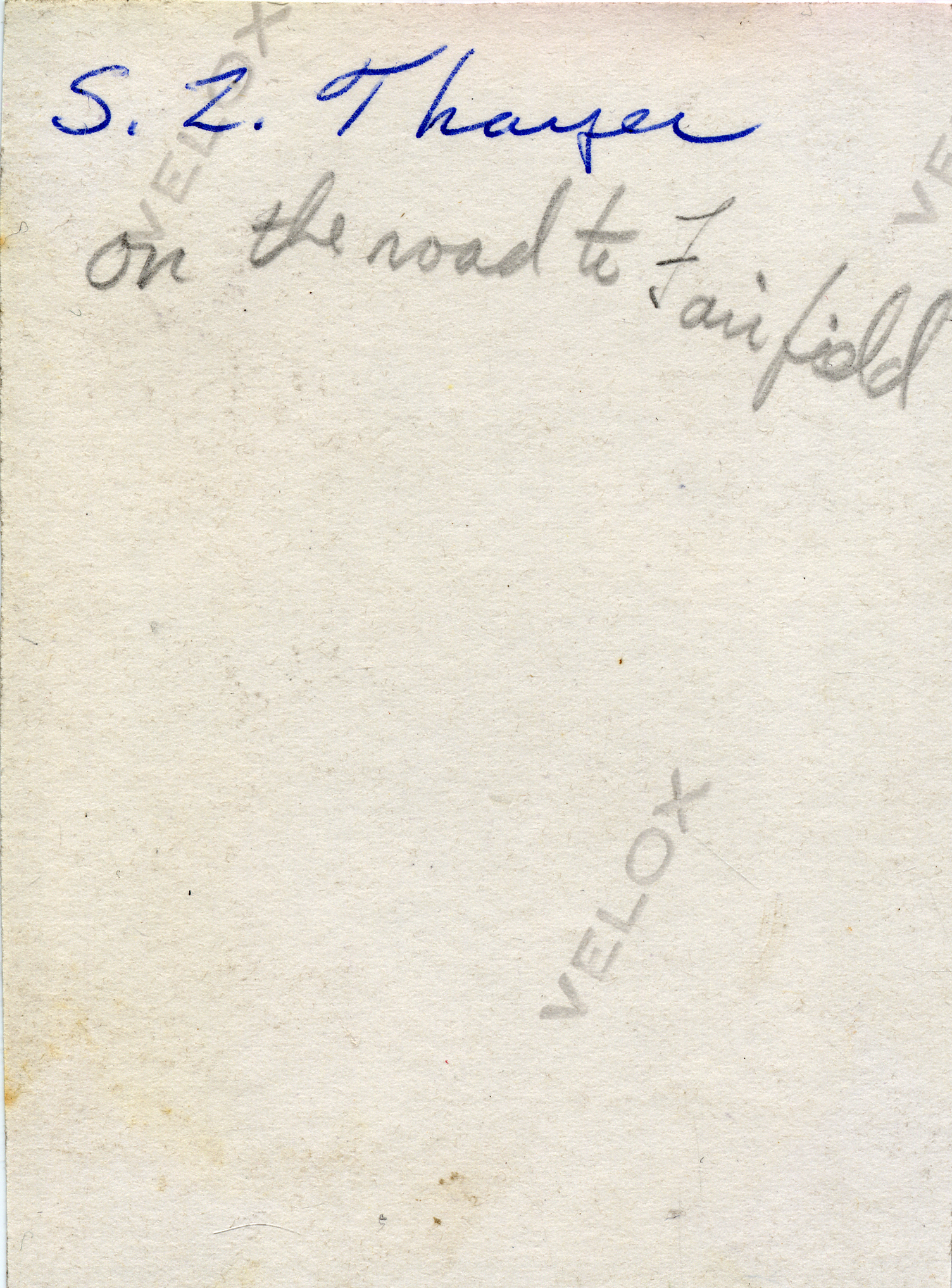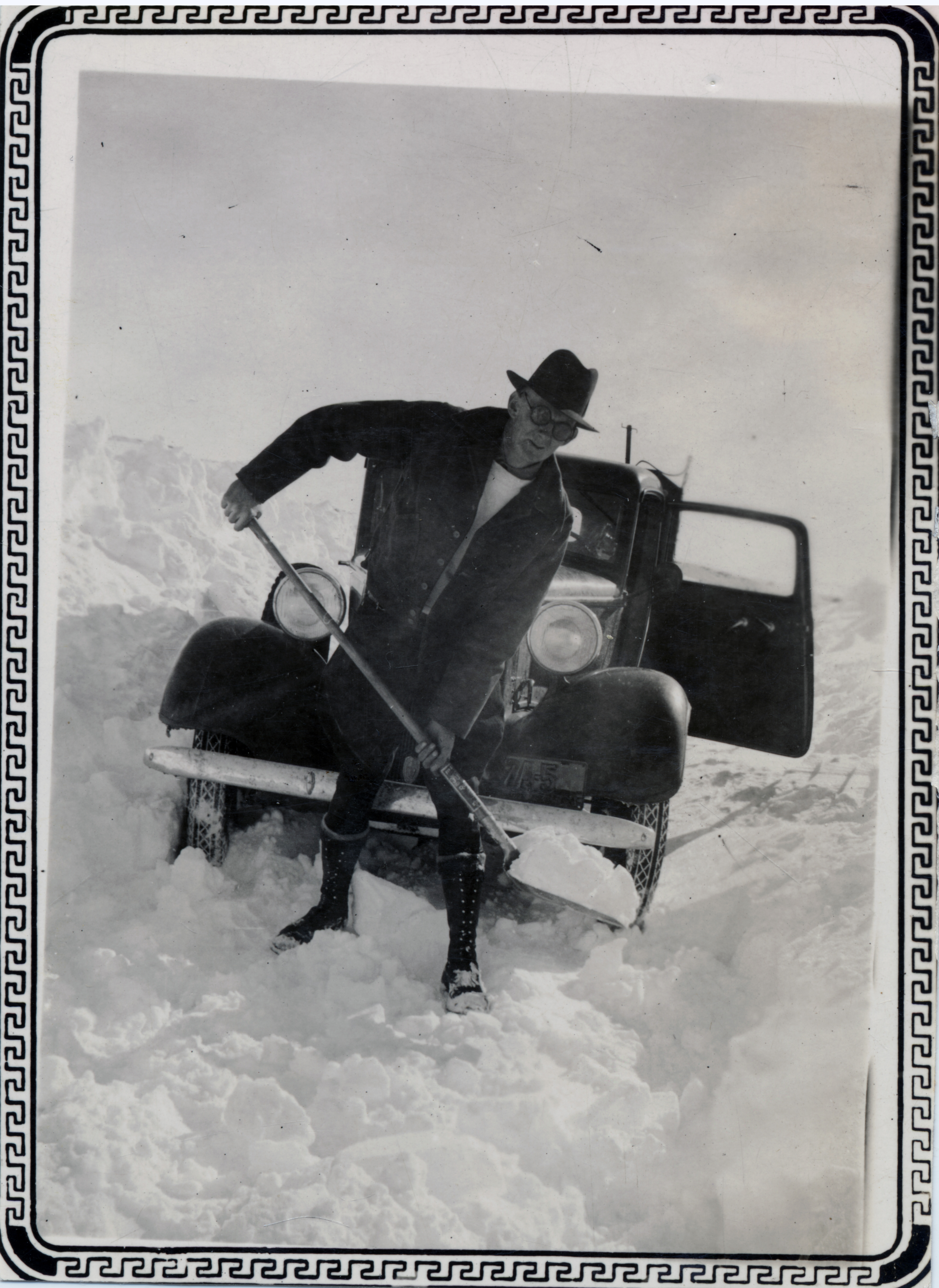 - A man shovels the snow in front of an automobile. On the back is written: "S.Z. Thayer on the road to Fairfield."