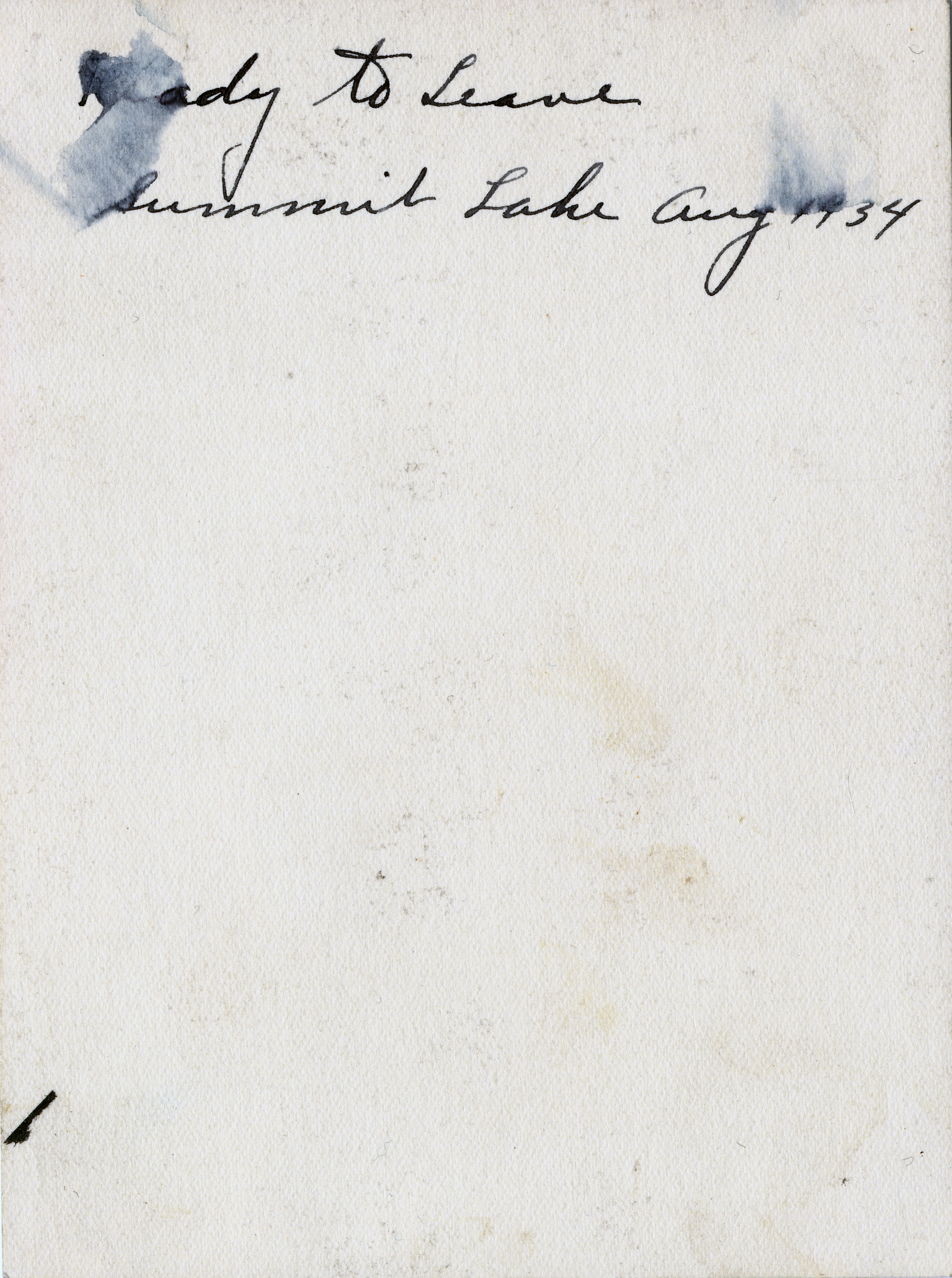 - A group of people stand around two automobiles at a campsite. One automobile has a canoe tied to the top. The photo is captioned: "Camping with Alfords." On the back of the photo is written "Ready to leave Summit Lake Aug 1934."