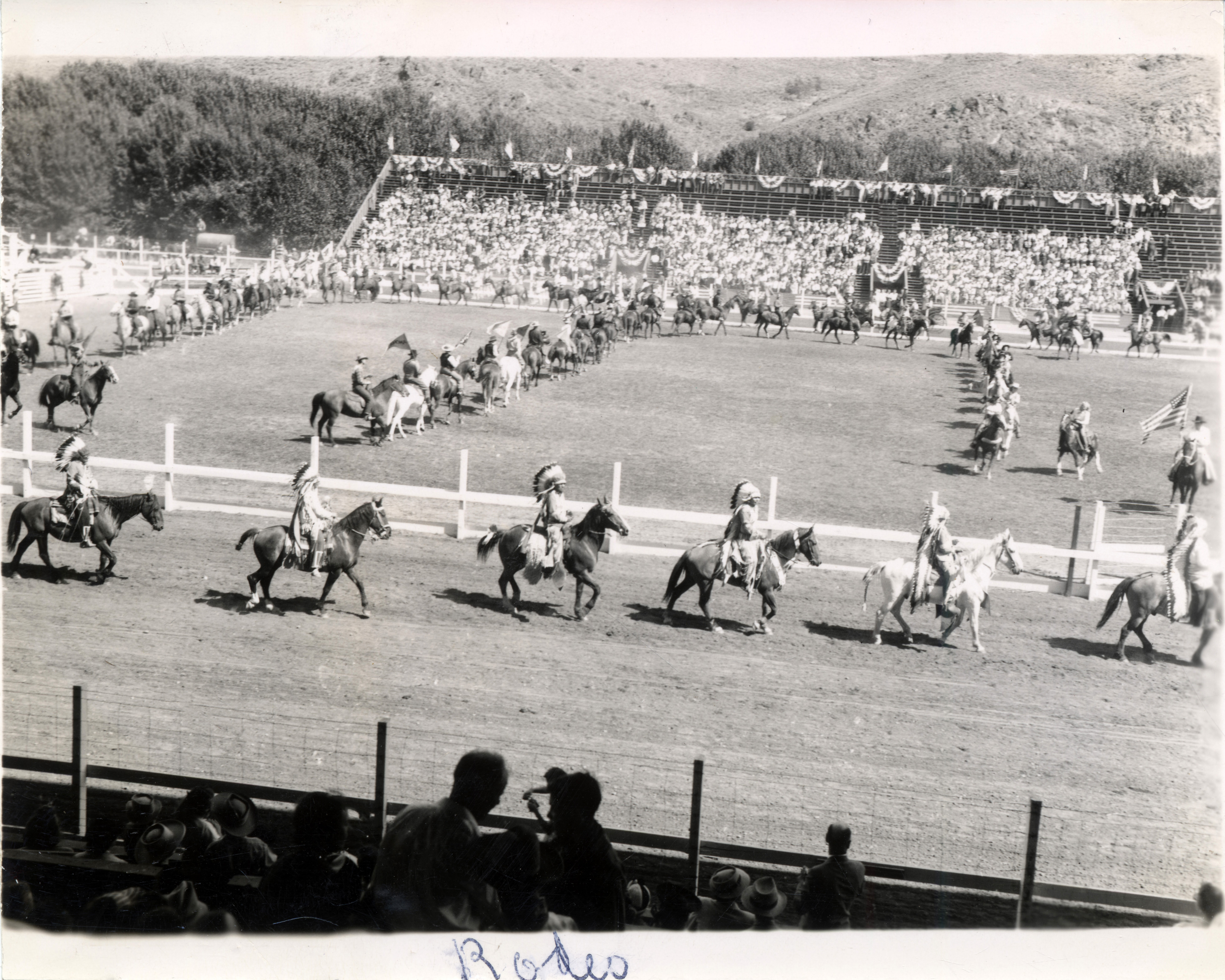 - A group of people wearing feathered head coverings ride horses in front of the rodeo arena. The picture is captioned "rodeo."